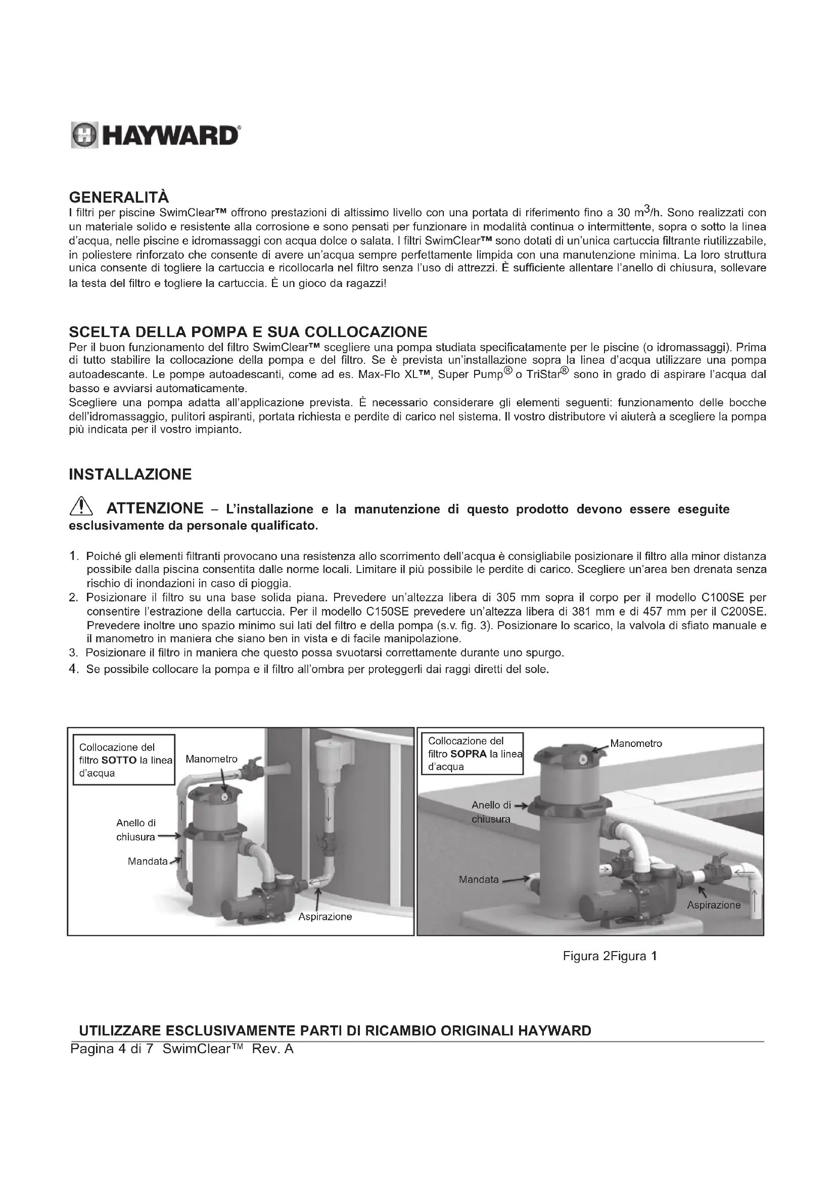Dati da conservare Nota REGISTRAZIONEUTILIZZARE ESCLUSIVAMENTE PARTI DI RICAMBIO ORIGINALI HAYWARD Pagina 4 di 7 SwimClear™ Rev. A GENERALITÀ I filtri per piscine SwimClear™ offrono prestazioni di altissimo livello con una portata di riferimento fino a 30 m