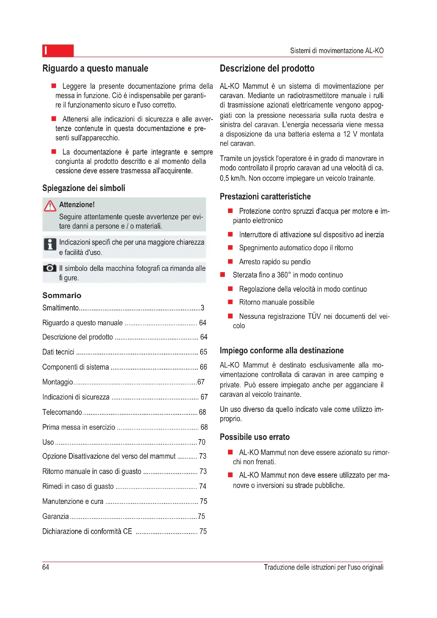 - Sistemi di movimentazione AL-KO Descrizione del prodotto AL-KO Mammut è un sistema di movimentazione per caravan. Mediante un radiotrasmettitore manuale i rulli di trasmissione azionati elettricamente vengono appog- giati con la pressione necessaria sulla ruota destra e sinistra del caravan. L'energia necessaria viene messa a disposizione da una batteria esterna a 12 V montata nel caravan. Tramite un joystick l'operatore è in grado di manovrare in modo controllato il proprio caravan ad una velocità di ca. 0,5 km/h. Non occorre impiegare un veicolo trainante. Prestazioni caratteristiche Protezione contro spruzzi d'acqua per motore e im- pianto elettronico Interruttore di attivazione sul dispositivo ad inerzia Spegnimento automatico dopo il ritorno Arresto rapido su pendio Sterzata fi no a 360° in modo continuo Regolazione della velocità in modo continuo Ritorno manuale possibile Nessuna registrazione TÜV nei documenti del vei- colo Impiego conforme alla destinazione AL-KO Mammut è destinato esclusivamente alla mo- vimentazione controllata di caravan in aree camping e private. Può essere impiegato anche per agganciare il caravan al veicolo trainante. Un uso diverso da quello indicato vale come utilizzo im- proprio. Possibile uso errato AL-KO Mammut non deve essere azionato su rimor- chi non frenati. AL-KO Mammut non deve essere utilizzato per ma- novre o inversioni su strade pubbliche. Riguardo a questo manuale Leggere la presente documentazione prima della messa in funzione. Ciò è indispensabile per garanti- re il funzionamento sicuro e l'uso corretto. Attenersi alle indicazioni di sicurezza e alle avver- tenze contenute in questa documentazione e pre- senti sull'apparecchio. La documentazione è parte integrante e sempre congiunta al prodotto descritto e al momento della cessione deve essere trasmessa all'acquirente. Spiegazione dei simboli Attenzione! Seguire attentamente queste avvertenze per evi- tare danni a persone e / o materiali. Indicazioni specifi che per una maggiore chiarezza e facilità d'uso. Il simbolo della macchina fotografi ca rimanda alle fi gure. Sommario Smaltimento p. 3