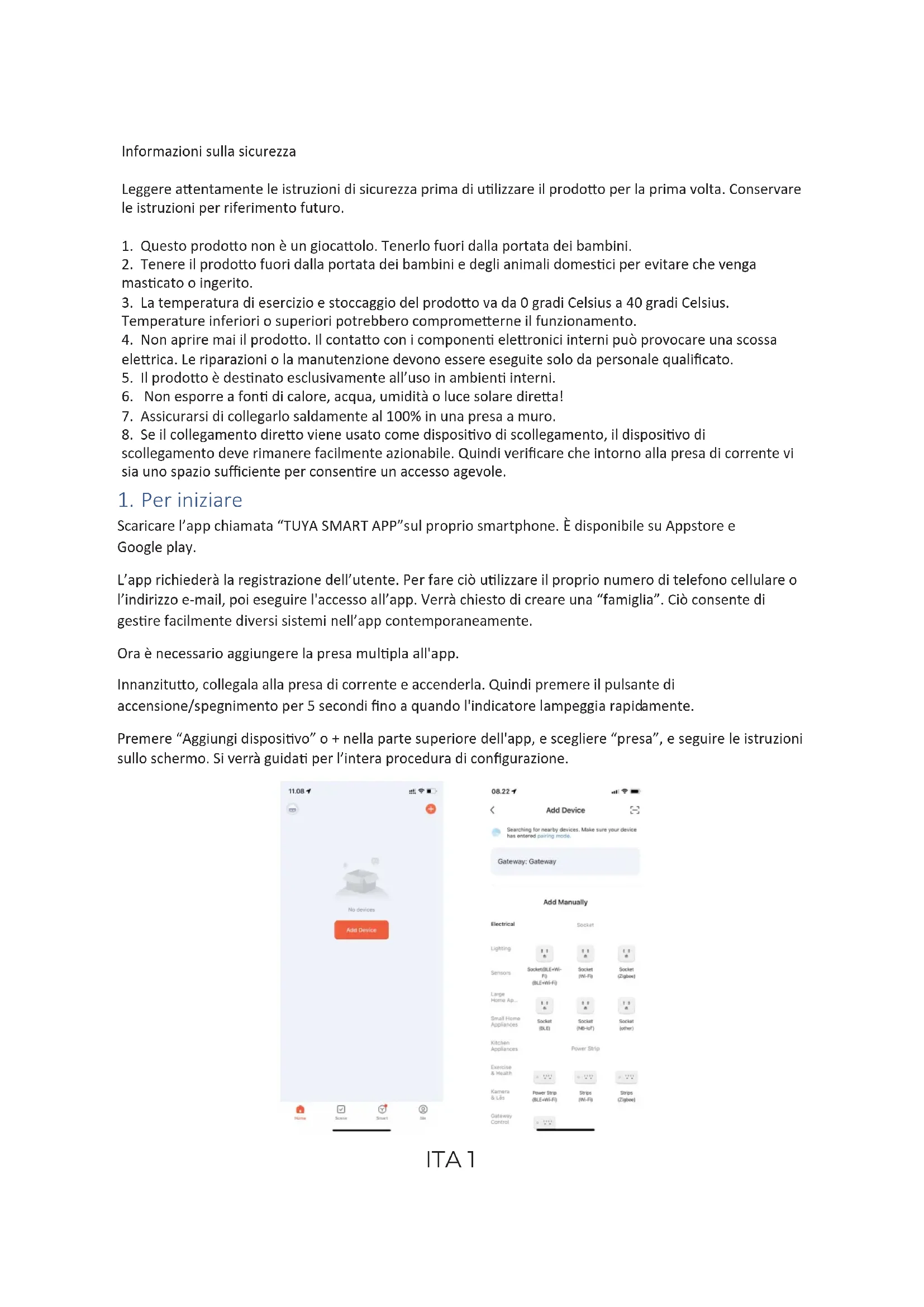 Scaricare l’app chiamata “TUYASMARTAPP”sul proprio smartphone. È disponibile su Appstore e Google play. L’app richiederà la registrazione dell’utente. Per fare ciò ulizzare il proprio numero di telefono cellulare o l’indirizzo e-mail, poi eseguire l'accesso all’app. Verrà chiesto di creare una “famiglia”. Ciò consente di gesre facilmente diversi sistemi nell’app contemporaneamente. Ora è necessario aggiungere la presa mulpla all'app. Innanzituo, collegala alla presa di corrente e accenderla. Quindi premere il pulsante di accensione/spegnimento per 5 secondi fino a quando l'indicatore lampeggia rapidamente. Premere “Aggiungi disposivo” o + nella parte superiore dell'app, e scegliere “presa”, e seguire le istruzioni sullo schermo. Si verrà guida per l’intera procedura di configurazione. ITA 12. Uso quodiano Nella schermata iniziale dell'app è possibile trovare la propria presa mulpla. Spingere e si arriverà alla pagina della spina di alimentazione. Qui è possibile accendere, spegnere, creare mer ecc.