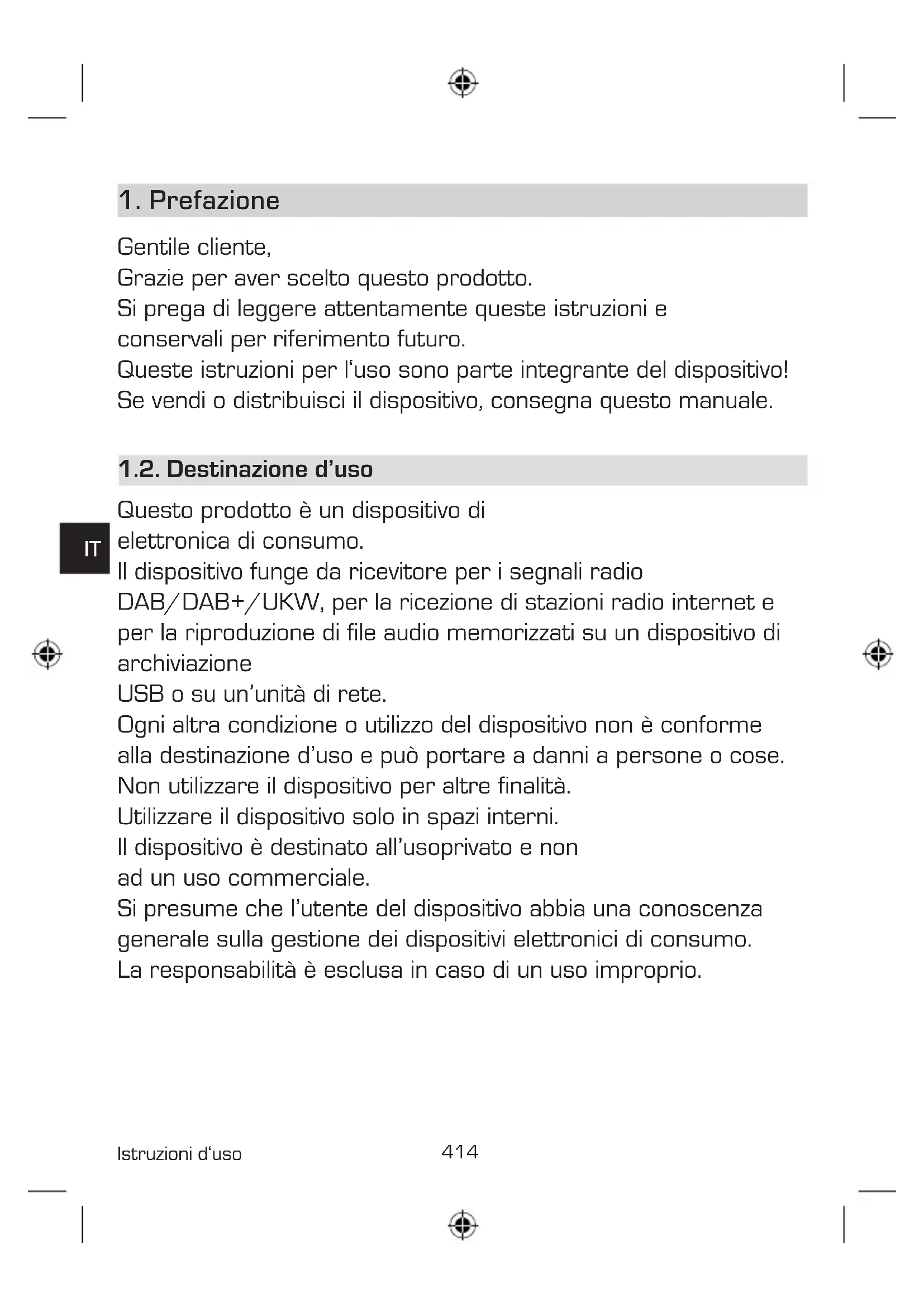 Gentile cliente, Grazie per aver scelto questo prodotto. Si prega di leggere attentamente queste istruzioni e conservali per riferimento futuro. Queste istruzioni per l‘uso sono parte integrante del dispositivo! Se vendi o distribuisci il dispositivo, consegna questo manuale. 1.2. Destinazione d’uso Questo prodotto è un dispositivo di elettronica di consumo. Il dispositivo funge da ricevitore per i segnali radio DAB/DAB+/UKW, per la ricezione di stazioni radio internet e per la riproduzione di file audio memorizzati su un dispositivo di archiviazione USB o su un’unità di rete. Ogni altra condizione o utilizzo del dispositivo non è conforme alla destinazione d’uso e può portare a danni a persone o cose. Non utilizzare il dispositivo per altre finalità. Utilizzare il dispositivo solo in spazi interni. Il dispositivo è destinato all’usoprivato e non ad un uso commerciale. Si presume che l’utente del dispositivo abbia una conoscenza generale sulla gestione dei dispositivi elettronici di consumo. La responsabilità è esclusa in caso di un uso improprio.