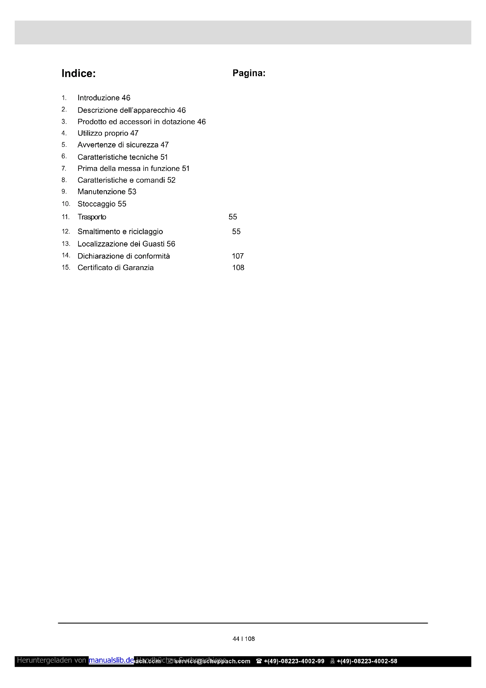 cio pulito, asciutto, con corretta ventilazione. m Non stoccare mai la macchina con carburante in un‘area non ventilata, nella quale i vapori di benzina possono entrare in contatto con amme, scintille, amme pilota o altre fonti di accensione. Heruntergeladen von manualslib.de Handbücher-Suchmachiene www.scheppach.com service@scheppach.com +(49)-08223-4002-99 +(49)-08223-4002-58 56 I 108