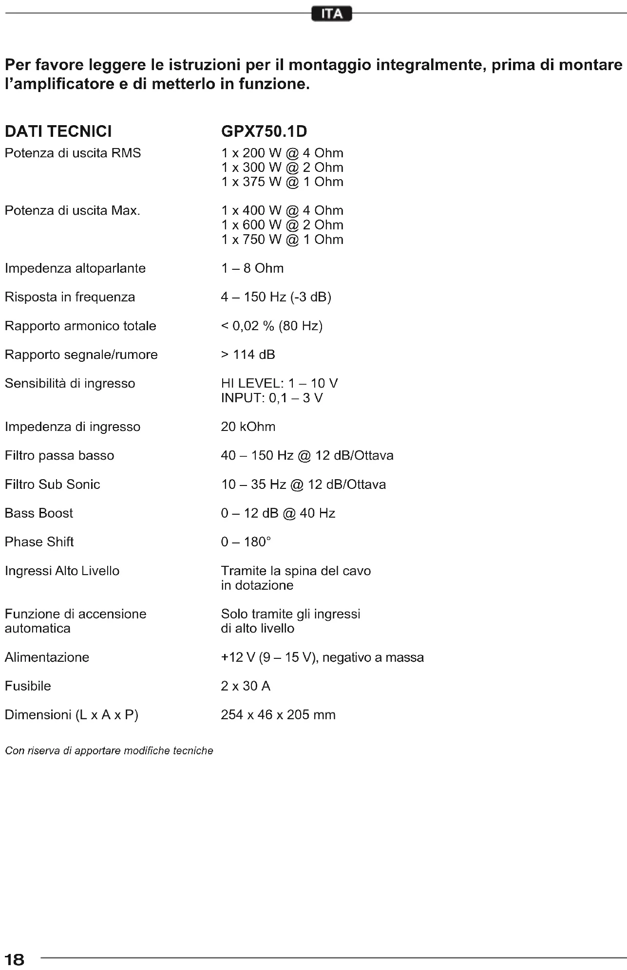 5.Faiteseffectuerparvotremécanicienunessaidechargeauniveaudel’alternateuretdelabatterie.Vériezquelecircuit électrique du véhicule fonctionne correctement,notamment le distributeur,les bougies et leurs câbles,le régulateur de tension, etc.18 Per favore leggere le istruzioni per il montaggio integralmente, prima di montare l’amplicatore e di metterlo in funzione. DATI TECNICI Potenza di uscita RMS Potenza di uscita Max. Impedenza altoparlante Risposta in frequenza Rapporto armonico totale Rapporto segnale/rumore Sensibilità di ingresso Impedenza di ingresso Filtro passa basso Filtro Sub Sonic Bass Boost Phase Shift Ingressi Alto Livello Funzione di accensione automatica Alimentazione Fusibile Dimensioni (L x A x P) 1 x 200 W @ 4 Ohm 1 x 300 W @ 2 Ohm 1 x 375 W @ 1 Ohm 1 x 400 W @ 4 Ohm 1 x 600 W @ 2 Ohm 1 x 750 W @ 1 Ohm 1 – 8 Ohm 4 – 150 Hz (-3 dB) < 0,02 % (80 Hz) > 114 dB