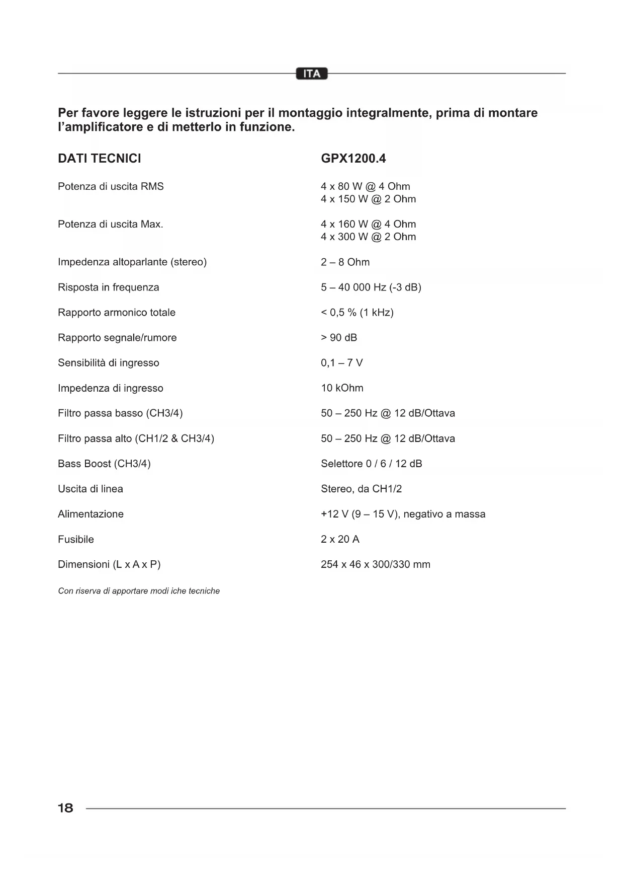 Procedura 5: Verica dell’amplicatore in caso si possa udire rumore di motore. 1. Stendete tutti cavi che trasportano segnale audio (RCA, cavi degli altoparlanti) lontano dai cavi di alimentazione e di massa. OPPURE 2. Escludere tutte i componenti elettrici tra la sorgente e l´amplicatore (i).Collegate la sorgente direttamente dall’ingresso dell’amplicatore. Se il rumore sparisse signica che i componenti saltati sono la causa del rumore. OPPURE 3. Eliminate e rifate tutte le masse portandole ad un punto diverso dell’auto. Controllate che il punto di massa sia fatto su una supercie metallica pulita, senza vernice, ruggine, ecc. OPPURE 4. Aggiungete un cavo ulteriore per la massa dal terminale negativo della batteria al metallo del telaio o del monoblocco del veicolo. OPPURE 5. Fate esaminare sia l’alternatore che tutto il circuito di ricarica del veicolo da un professionista. Controllate che il sistema elettrico del veicolo sia funzionante,compreso il distributore,le candele,i cavi delle candele,il regolatore di tensione,ecc.23 Lea completamente las instrucciones de montaje antes de proceder a montar el amplicador y ponerlo en funcionamiento. GPX1200.4 4 x 80 W @ 4 ohmios 4 x 150 W @ 2 ohmios 4 x 160 W @ 4 ohmios 4 x 300 W @ 2 ohmios 2 – 8 ohmios 5 – 40 000 Hz (-3 dB) < 0,5 % (1 kHz) > 90 dB 0,1 – 7 V 10 kohmios 50 – 250 Hz @ 12 dB/octava 50 – 250 Hz @ 12 dB/octava Cambiable 0 / 6 / 12 dB Estéreo, de CH1/2 +12 V (9 – 15 V), negativo a tierra 2 x 20 A 254 x 46 x 300/330 mm