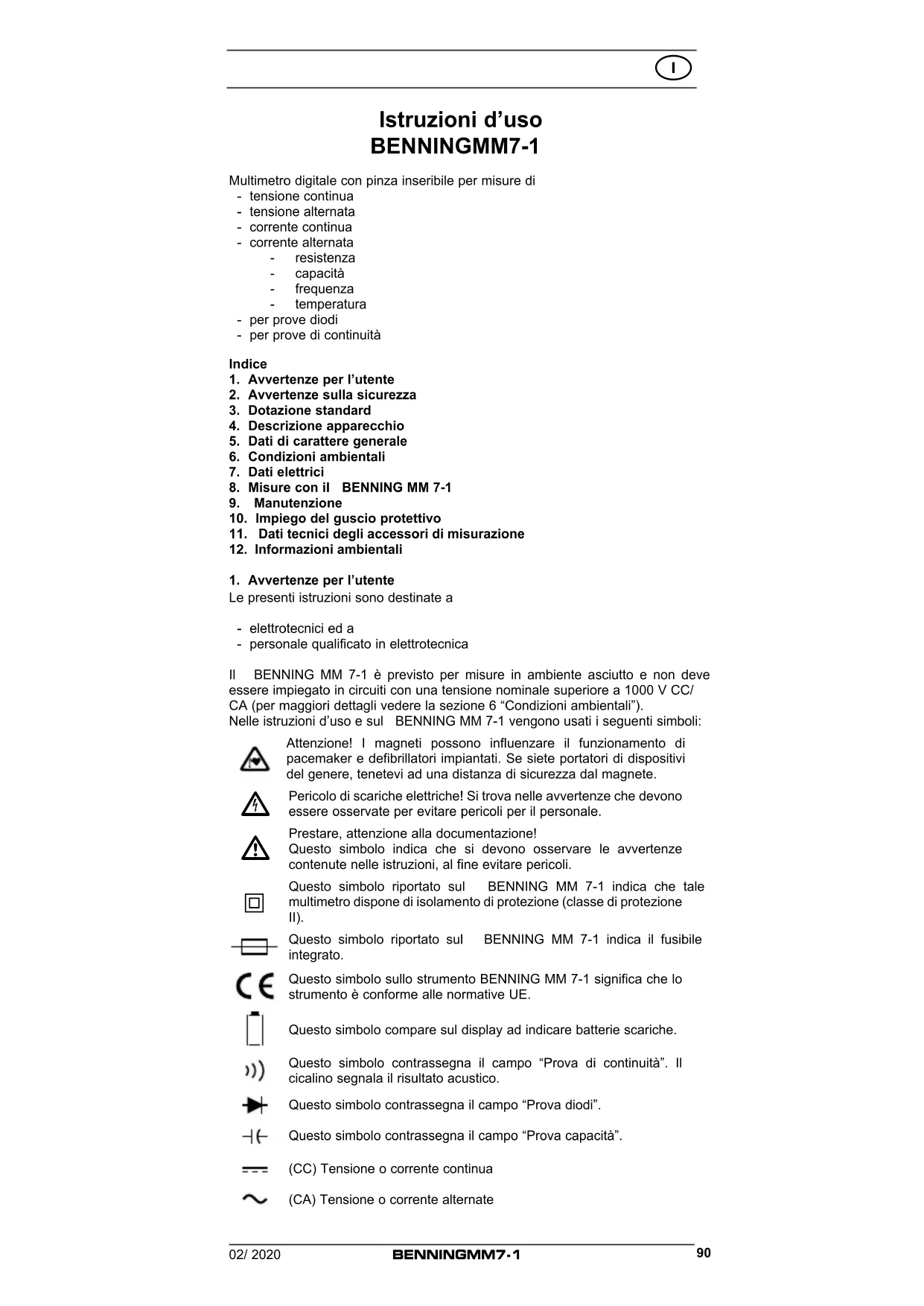Prima di aprire il BENNING MM 7-1 assicurarsi che esso non sia sotto tensione! Pericolo di scariche elettriche! Lavori sul BENNING MM 7-1 aperto e sotto tensione sono riservati esclusi- vamente ad elettrotecnici, che devono prendere particolari misure per la prevenzione di infortuni. Il BENNING MM 7-1 deve essere reso libero da tensione, prima di spegnerlo,02/ 2020