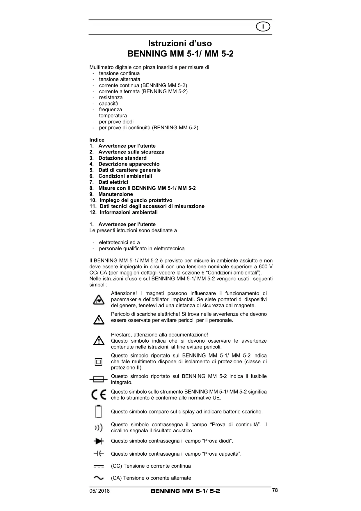 Il BENNING MM 5-1/ MM 5-2 è previsto per misure in ambiente asciutto e non deve essere impiegato in circuiti con una tensione nominale superiore a 600 V CC/ CA (per maggiori dettagli videere la sezione 6 "Condizioni ambientali"). Nelle istruzioni d'uso e sul BENNING MM 5-1/ MM 5-2 vengono usati i seguenti symboli: