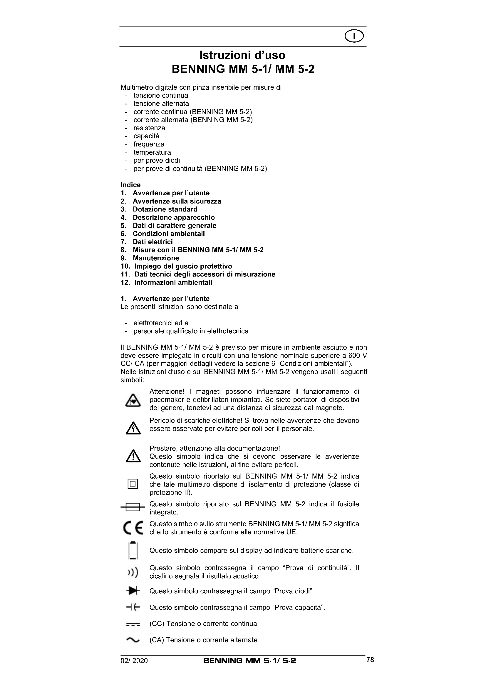 Questo simbolo riportato sul BENNING MM 5-1/ MM 5-2 indica che tale multimetro dispone di isolamento di protezione (classe di protezione II). Questo simbolo riportato sul BENNING MM 5-2 indica il fusibile integrato. Questo simbolo sullo strumento BENNING MM 5-1/ MM 5-2 significa che lo strumento è conforme alle normative UE. Questo simbolo compare sul display ad indicare batterie scariche. Questo simbolo contrassegna il campo “Prova di continuità”. Il cicalino segnala il risultato acustico. Questo simbolo contrassegna il campo “Prova diodi”. Questo simbolo contrassegna il campo “Prova capacità”. (CC) Tensione o corrente continua (CA) Tensione o corrente alternate02/ 2020