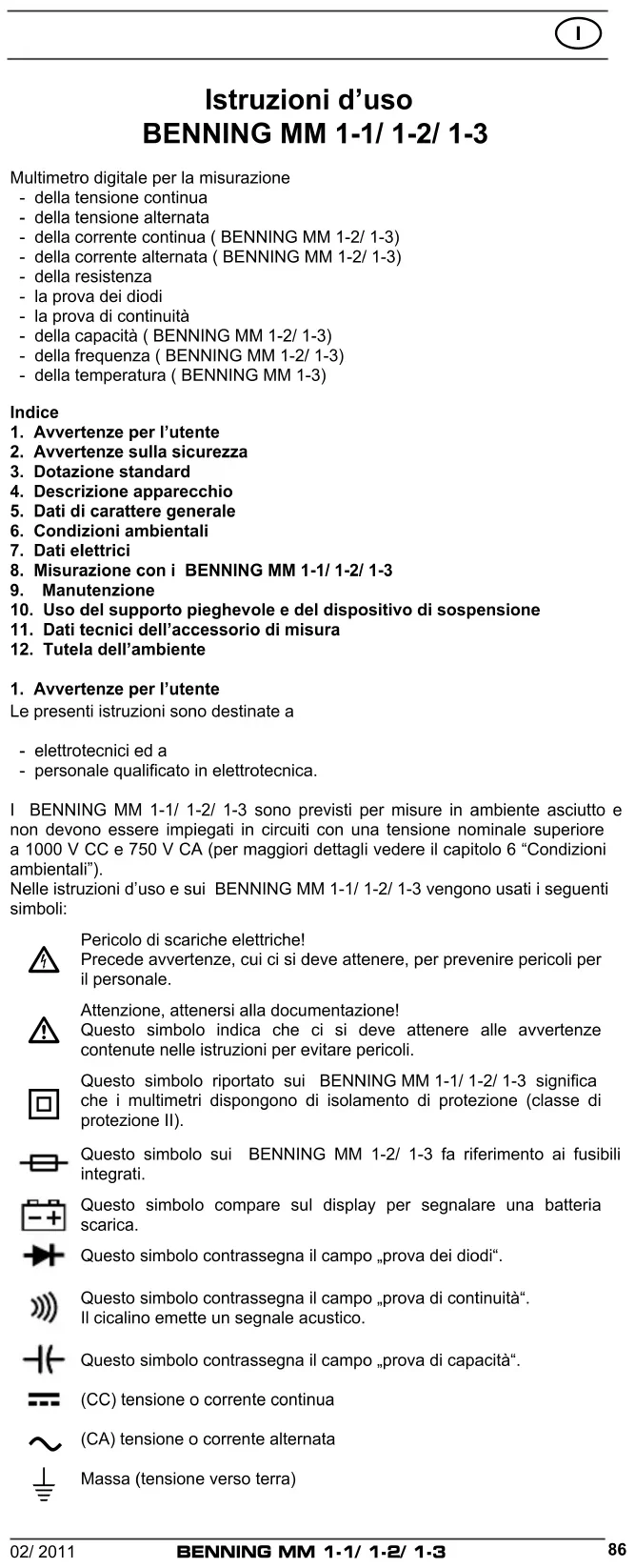 Istruzioni d’uso BENNING MM 1‑1/ 1‑2/ 1‑3 Multimetro digitale per la misurazione - della tensione continua - della tensione alternata - della corrente continua ( BENNING MM 1-2/ 1-3) - della corrente alternata ( BENNING MM 1-2/ 1-3) - della resistenza - la prova dei diodi - la prova di continuità - della capacità ( BENNING MM 1-2/ 1-3) - della frequenza ( BENNING MM 1-2/ 1-3) - della temperatura ( BENNING MM 1-3) Indice