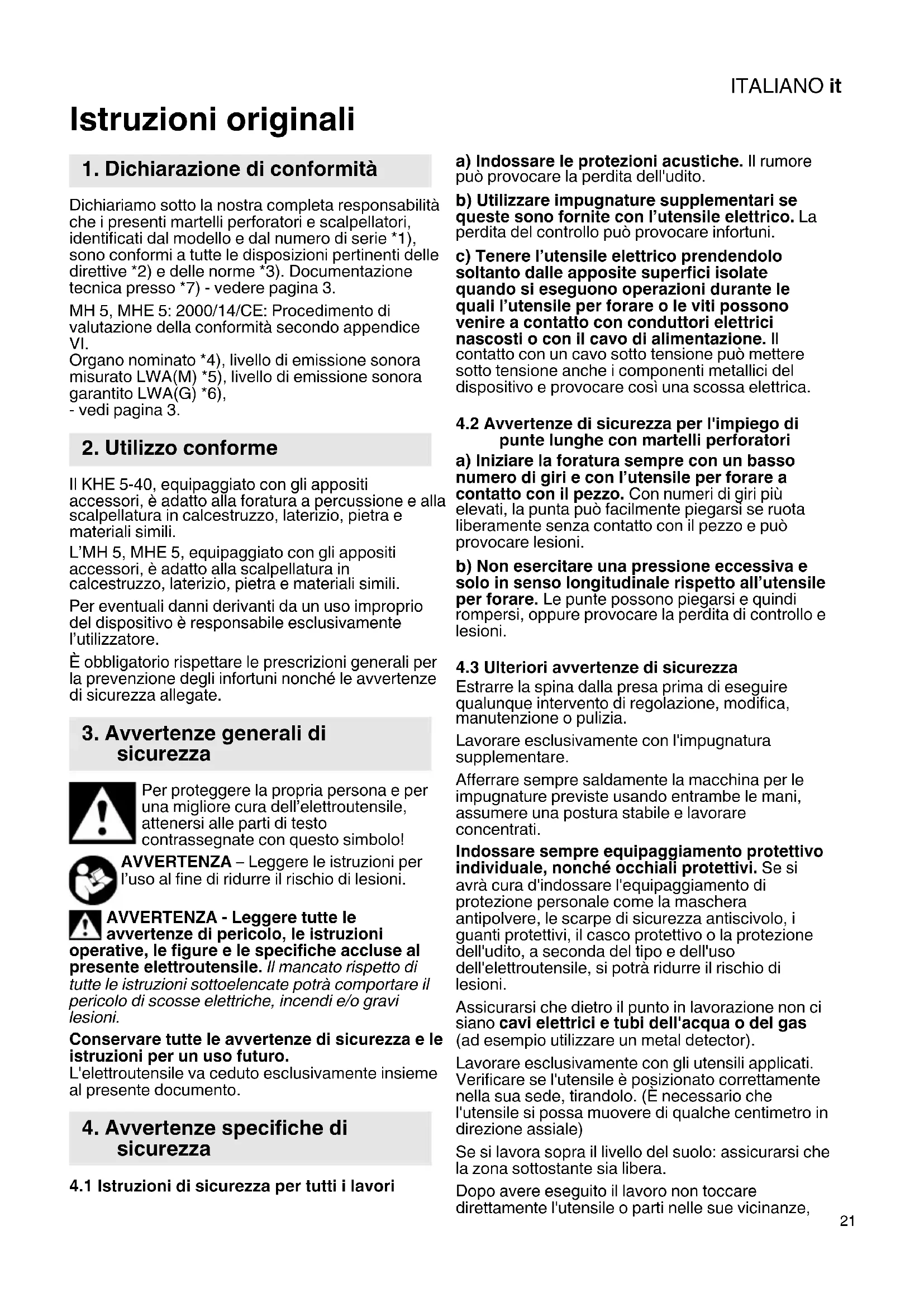 4.2 Avvertenze di sicurezza per l'impiego di punte lunghe con martelli perforatori a) Iniziare la foratura sempre con un basso numero di giri e con l'utensile per forare a contagatto con il pezzo. Con numero di giri più elevati, la punta può essere piegarsi se ruota liberamente perché contatto con il pezzo e può provocare lesioni.