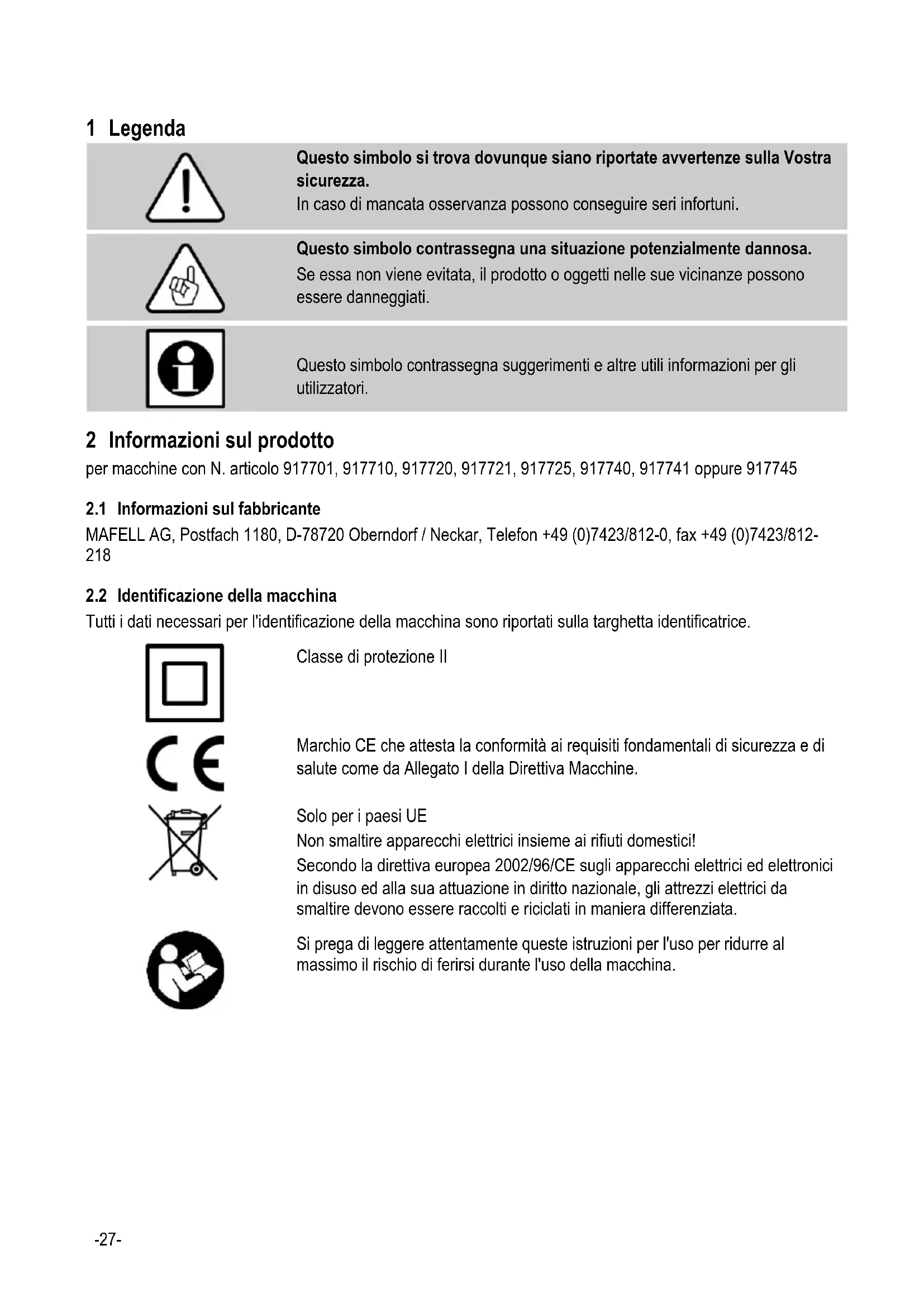 2 Informazioni sul prodotto per macchine con N. articolo 917701, 917710, 917720, 917721, 917725, 917740, 917741 oppure 917745