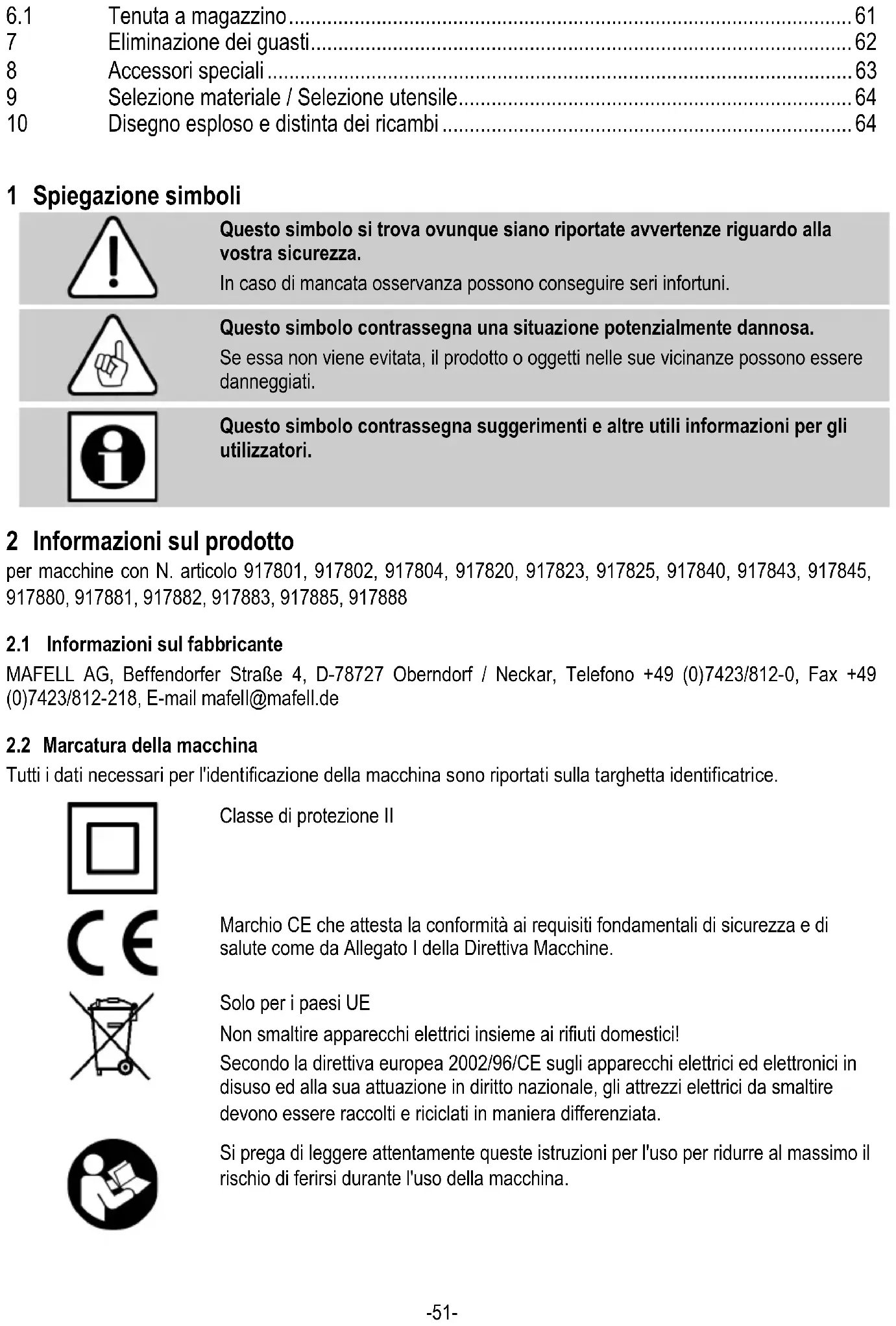 Questo simbolo contrassegna suggerimenti e altre utili informazioni per gli utilizzatori. 2 Informazioni sul prodotto per macchine con N. articolo 917801, 917802, 917804, 917820, 917823, 917825, 917840, 917843, 917845, 917880, 917881, 917882, 917883, 917885, 917888