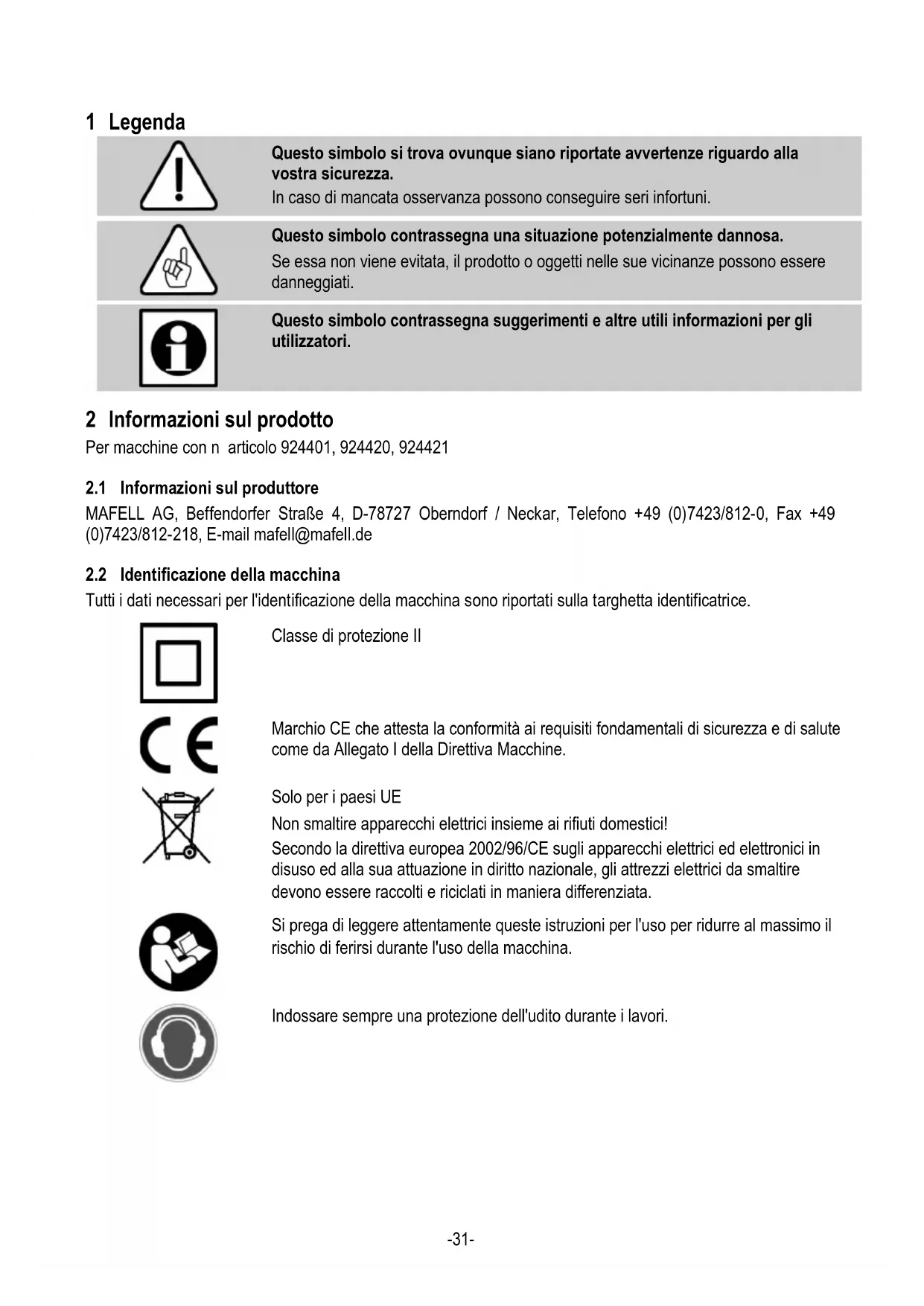 Questo simbolo contrassegna suggerimenti e altre utili informazioni per gli utilizzatori. 2 Informazioni sul prodotto Per macchine con n articolo 924401, 924420, 924421