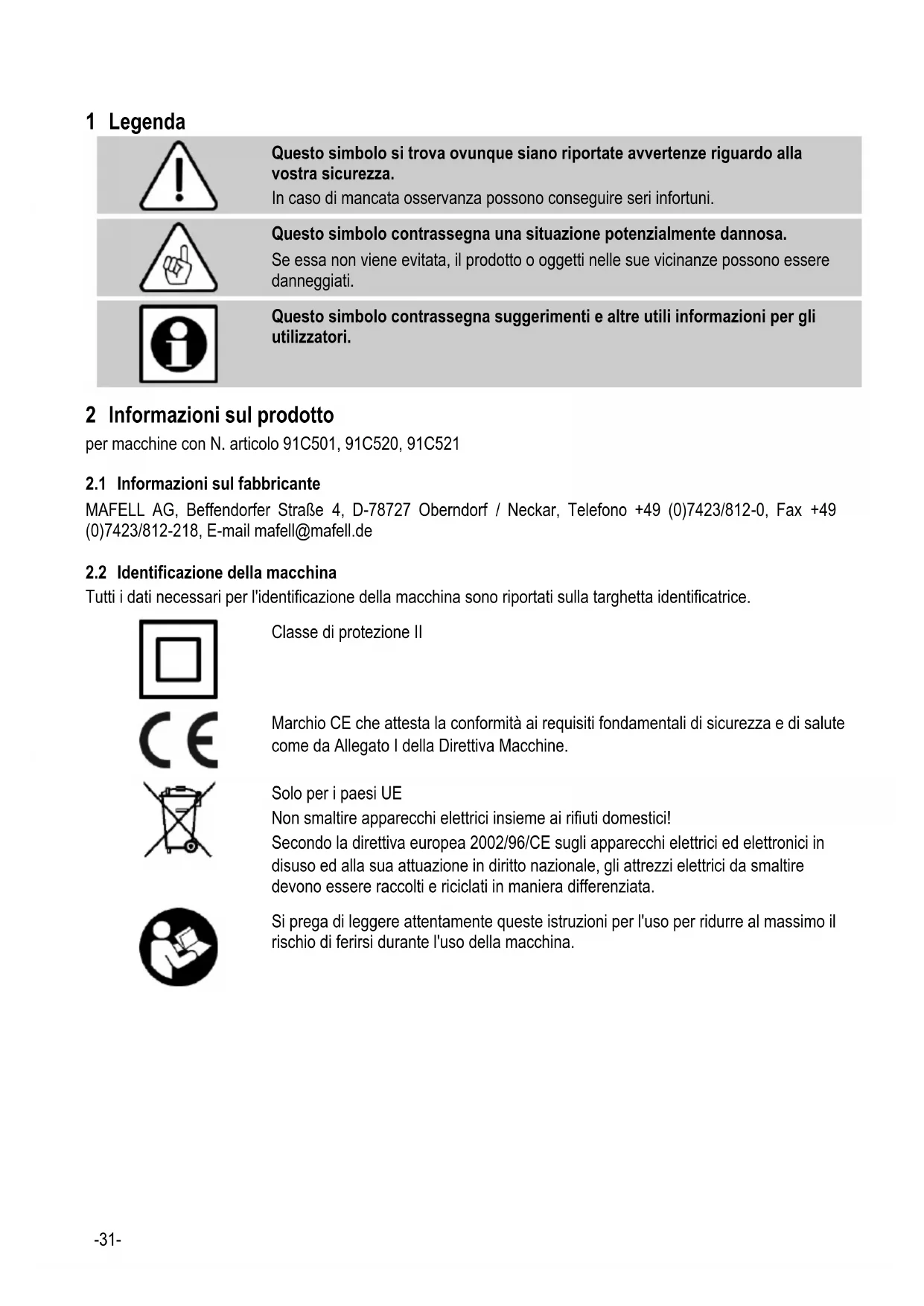 2 Informazioni sul prodotto per macchine con N. articolo 91C501, 91C520, 91C521