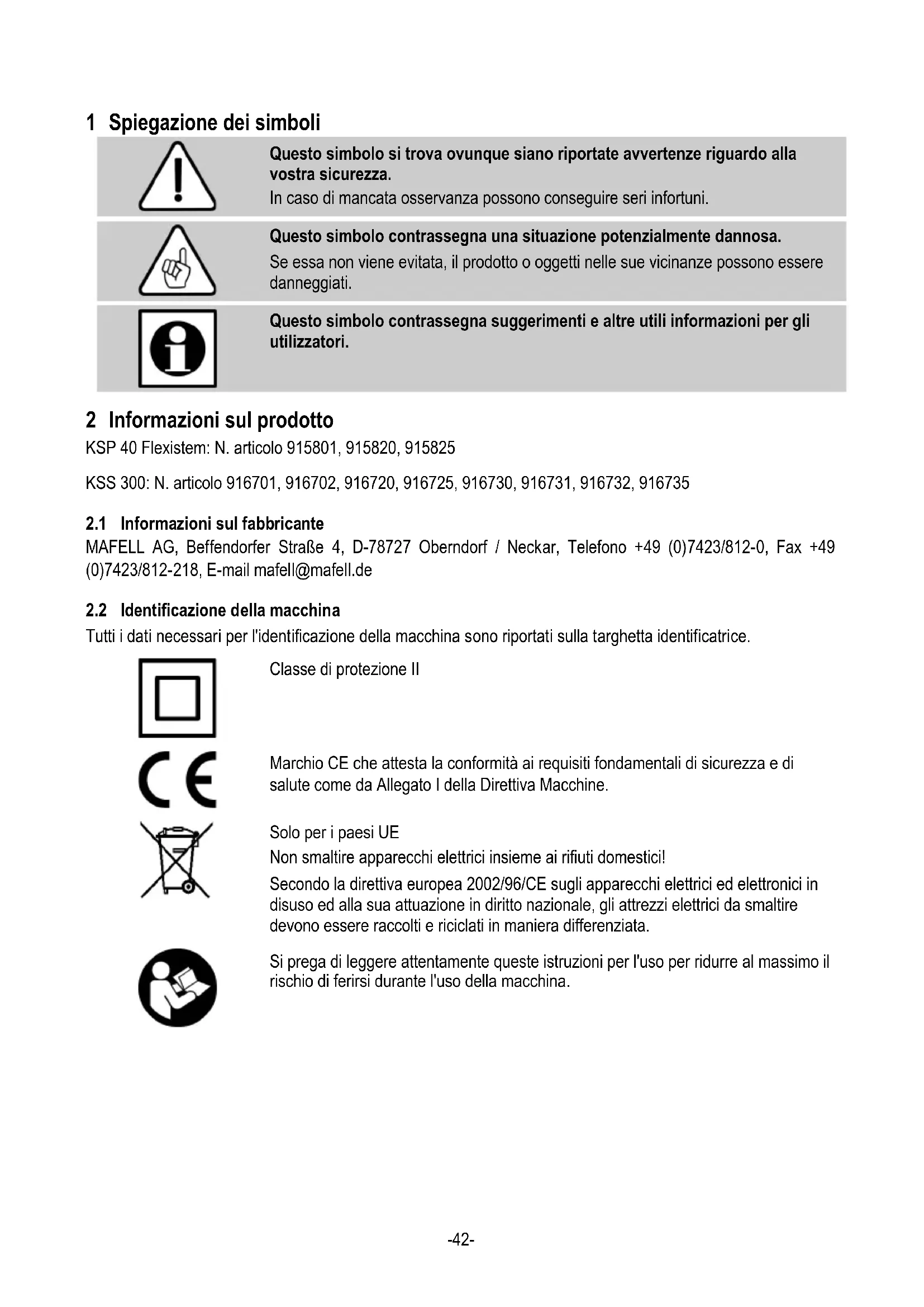 Pericolo Nonostante l'uso conforme alla destinazione e l'osservanza delle disposizioni di sicurezza restano dei rischi residui causati dall'uso previsto, i quali potrebbero comportare di conseguenza danni alla salute. - Contatto con la lama da taglio in corrispondenza dell'apertura al di sotto del piano di appoggio. - In fase di taglio, contatto con la parte della lama da taglio sporgente da sotto al pezzo. - Contatto con le parti girevoli dal lato: lama da taglio, flangia di serraggio e vite della flangia. - Contraccolpo della macchina in caso di inceppamento nel pezzo. - Rottura e fuoriuscita della lama da taglio o di sue parti. - Contatto con pezzi sotto tensione con alloggiamento aperto e spina elettrica non estratta. - Danneggiamento dell'udito in caso di lavori prolungati senza cuffie protettive. - Emissione di polveri di legno nocive alla salute in caso di lavoro prolungato senza impianto di aspirazione. - Apertura di scatto della barra guida flessibile se utilizzata scorrettamente. 3 Avvertenze di sicurezza Pericolo Osservate sempre le seguenti avvertenze di sicurezza e le disposizioni di sicurezza vigenti nel paese di utilizzazione! Leggere anche le avvertenze di sicurezza contenute nell'opuscolo allegato «Avvertenze di sicurezza». Avvertenze di carattere generale: - È assolutamente vietato che questa macchina venga usata da bambini o da ragazzi. Fanno eccezione giovani sotto la sorveglianza di personale esperto ai fini di istruzione. - Non lavorate mai senza i dispositivi di protezione prescritti per il lavoro in questione e non modificate-46- nessun componente della macchina che ne possa compromettere la sicurezza. - Se si usa la macchina all'aperto si raccomanda l'uso di un interruttore magnetotermico di sicurezza per correnti di guasto. - Cavi o spine difettosi devono essere sostituiti immediatamente. La sostituzione deve essere eseguita solo da Mafell o da un’officina di assistenza clienti MAFELL autorizzata, per così evitare pericoli in materia di sicurezza. - Evitate di schiacciare o piegare fortemente il cavo. Non avvolgete il cavo intorno alla macchina, soprattutto durante il trasporto e l'immagazzinaggio della macchina. È vietato utilizzare: - lame da taglio crepate e lame dalla forma alterata; - lame da taglio in acciaio rapido altamente legato (lame in acciaio superrapido); - lame da taglio che non tagliano a causa dell'eccessiva sollecitazione del motore; - lame da taglio con uno spessore del corpo di base maggiore o con una larghezza di taglio minore dello spessore del cuneo divaricatore; - lame da taglio non adatte per la velocità della lama a vuoto. - Mole a disco Avvertenze per l'impiego di dispositivi di protezione individuali: - Indossare sempre una protezione dell'udito durante i lavori. - Indossare sempre una mascherina antipolvere durante i lavori. - Indossare per tutti i lavori indossare occhiali di protezione. Avvertenze relative al servizio: Procedura di sega