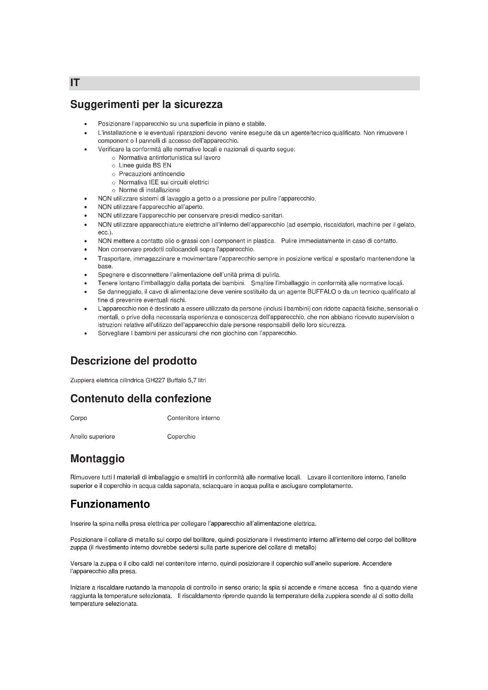 Alle Rechte vorbehalten. Diese Anleitung darf weder ganz noch auszugsweise ohne vorherige schriftliche Erlaubnis von BUFFALO in irgendeiner Form und auf irgendeinem Wege - ob elektronisch, mechanisch, durch Fotokopieren oder anderweitig - vervielfältigt oder übertragen werden.Es werden alle Anstrengungen unternommen um sicherzustellen, dass alle Angaben bei Drucklegung korrekt sind.BUFFALO behält sich jedoch das Recht vor, Spezifikationen ohne Vorankündigung zu ändern.IT Suggerimenti per la sicurezza Posizionare l’apparecchio su una superficie in piano e stabile. L’installazione e le eventuali riparazioni devono venire eseguite da un agente/tecnico qualificato. Non rimuovere I component o I pannelli di accesso dell’apparecchio. Verificare la conformità alle normative locali e nazionali di quanto segue: o Normativa antinfortunistica sul lavoro o Linee guida BS EN o Precauzioni antincendio o Normativa IEE sui circuiti elettrici o Norme di installazione NON utilizzare sistemi di lavaggio a getto o a pressione per pulire l’apparecchio. NON utilizzare l’apparecchio all’aperto. NON utilizzare l’apparecchio per conservare presidi medico-sanitari. NON utilizzare apparecchiature elettriche all’interno dell’apparecchio (ad esempio, riscaldatori, machine per il gelato, ecc.). NON mettere a contatto olio o grassi con I component in plastica. Pulire immediatamente in caso di contatto. Non conservare prodotti collocandoli sopra l’apparecchio. Trasportare, immagazzinare e movimentare l’apparecchio sempre in posizione vertical e spostarlo mantenendone la base. Spegnere e disconnettere l’alimentazione dell’unità prima di pulirla. Tenere lontano l’imballaggio dalla portata dei bambini. Smaltire l’imballaggio in conformità alle normative locali. Se danneggiato, il cavo di alimentazione deve venire sostituito da un agente BUFFALO o da un tecnico qualificato al fine di prevenire eventuali rischi. L’apparecchio non è destinato a essere utilizzato da persone (inclusi I bambini) con ridotte capacità fisiche, sensoriali o mentali, o prive della necessaria esperienza e conoscenza dell’apparecchio, che non abbiano ricevuto supervision o istruzioni relative all’utilizzo dell’apparecchio dale persone responsabili dello loro sicurezza. Sorvegliare I bambini per assicurarsi che non giochino con l’apparecchio. Descrizione del prodotto Zuppiera elettrica cilindrica GH227 Buffalo 5,7 litri Contenuto della confezione Corpo