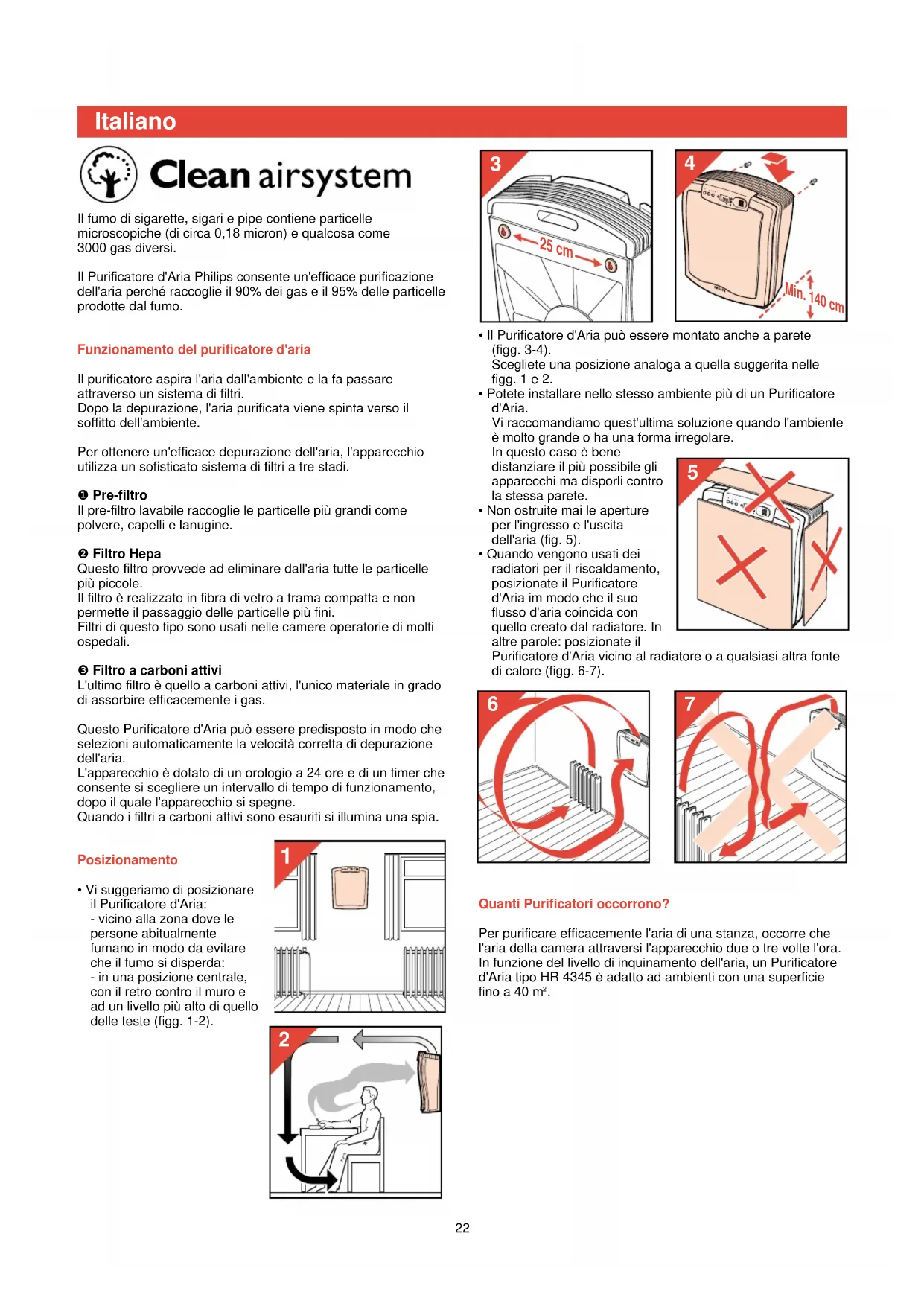 21• Il Purificatore d'Aria può essere montato anche a parete(figg. 3-4).Scegliete una posizione analoga a quella suggerita nellefigg. 1 e 2.• Potete installare nello stesso ambiente più di un Purificatored'Aria.Vi raccomandiamo quest'ultima soluzione quando l'ambienteè molto grande o ha una forma irregolare.In questo caso è benedistanziare il più possibile gliapparecchi ma disporli controla stessa parete.• Non ostruite mai le apertureper l'ingresso e l'uscitadell'aria (fig. 5).• Quando vengono usati deiradiatori per il riscaldamento,posizionate il Purificatored'Aria im modo che il suoflusso d'aria coincida conquello creato dal radiatore. Inaltre parole: posizionate ilPurificatore d'Aria vicino al radiatore o a qualsiasi altra fontedi calore (figg. 6-7).Quanti Purificatori occorrono?Per purificare efficacemente l'aria di una stanza, occorre chel'aria della camera attraversi l'apparecchio due o tre volte l'ora.In funzione del livello di inquinamento dell'aria, un Purificatored'Aria tipo HR 4345 è adatto ad ambienti con una superficiefino a 40 m