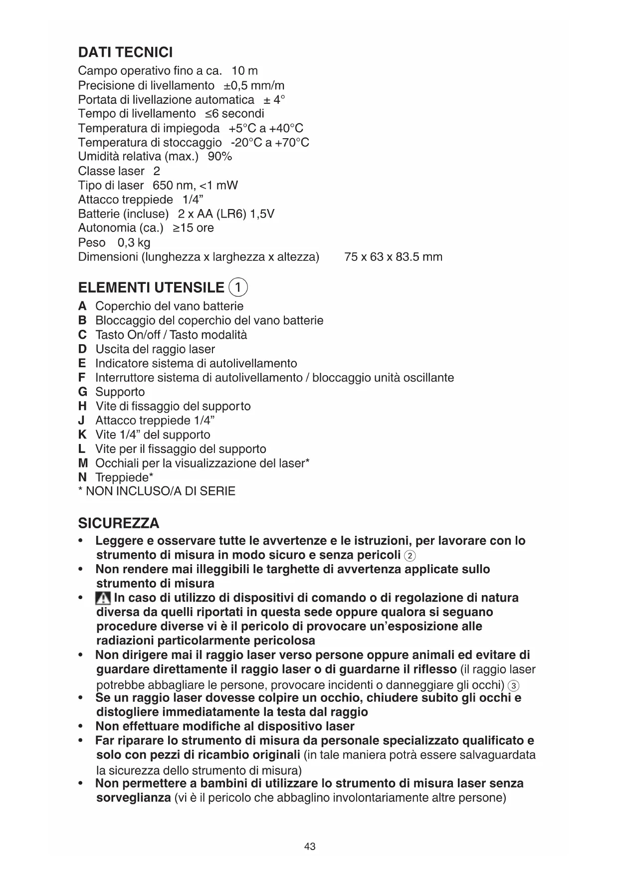 - Conservare con cura le presenti istruzioni e consegnarle insieme allo strumento di misura in caso di cessione a terzi43 DATI TECNICI Campo operativo no a ca. 10 m Precisione di livellamento ±0,5 mm/m Portata di livellazione automatica ± 4° Tempo di livellamento ≥6 secondi Temperatura di impiegoda +5°C a +40°C Temperatura di stoccaggio -20°C a +70°C Umidità relativa (max.) 90% Classe laser 2 Tipo di laser 650 nm, <1 mW Attacco treppiede 1/4” Batterie (incluse) 2 x AA (LR6) 1,5V Autonomia (ca.) ≤15 ore Peso 0,3 kg Dimensioni (lunghezza x larghezza x altezza) 75 x 63 x 83.5 mm ELEMENTI UTENSILE 1 A Coperchio del vano batterie B Bloccaggio del coperchio del vano batterie C Tasto On/o / Tasto modalità D Uscita del raggio laser E Indicatore sistema di autolivellamento F Interruttore sistema di autolivellamento / bloccaggio unità oscillante G Supporto H Vite di ssaggio del supporto J Attacco treppiede 1/4” K Vite 1/4” del supporto L Vite per il ssaggio del supporto M Occhiali per la visualizzazione del laser* N Treppiede*
