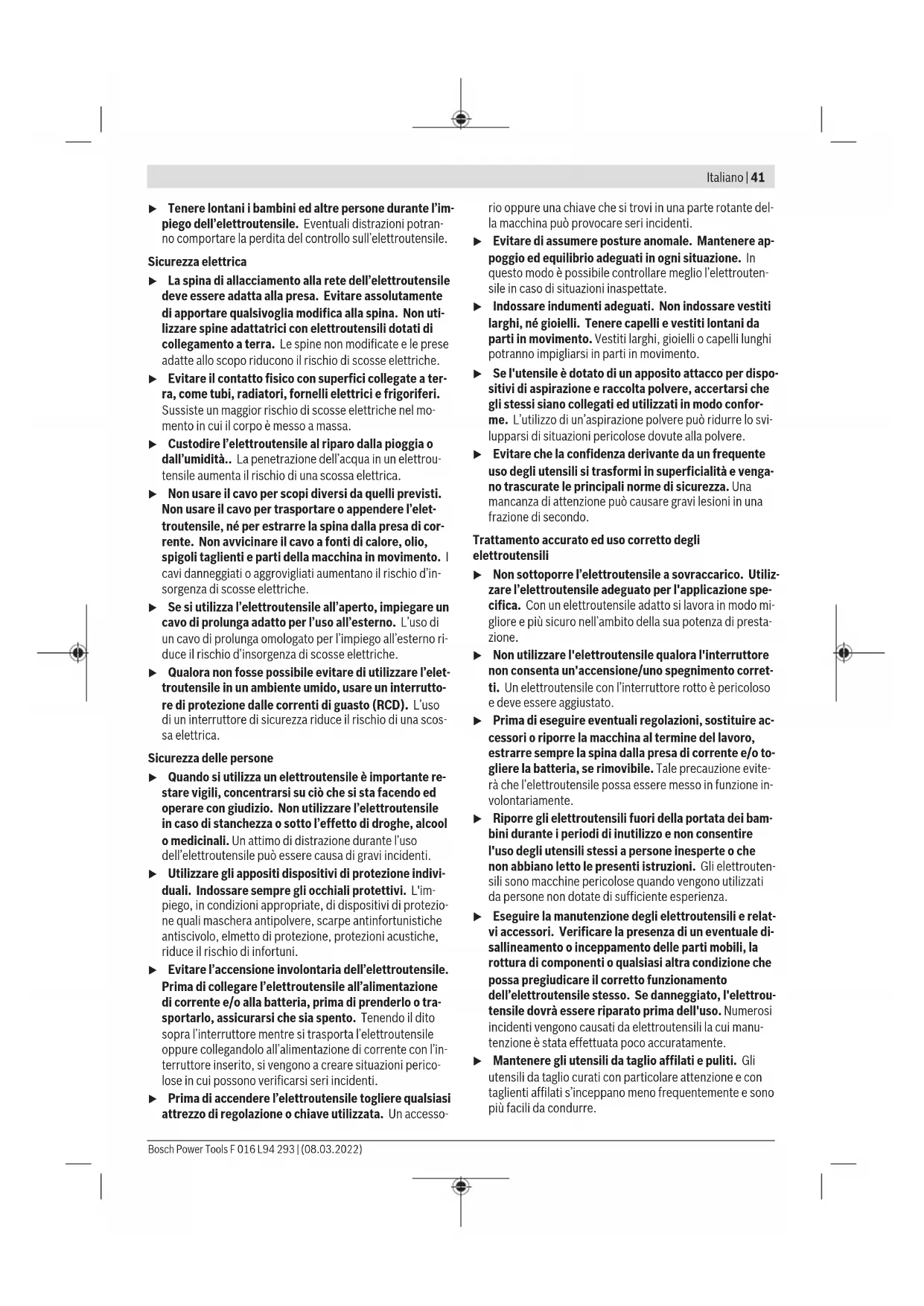 e durante il magazzinaggio °C -10 … +40 Tipo di batteria ricaricabile GBA 36V 2,0 Ah, 4,0 Ah A) In funzione della batteria utilizzata B) Prestazioni ridotte in caso di temperature <0°C. F 016 L94 293 | (08.03.2022) Bosch Power ToolsItaliano | 45 Informazioni sulla rumorosità e sulle vibrazioni Valori di emissione acustica rilevati conformemente a EN 62841-4-2:2019 . Il livello di rumore stimato A dell’elettroutensile ammonta normalmente: 75 dB(A); livello di potenza sonora 95 dB(A). Incertezza della misura K = 2,0dB. Usare la protezione acustica! Valori complessivi di oscillazione a