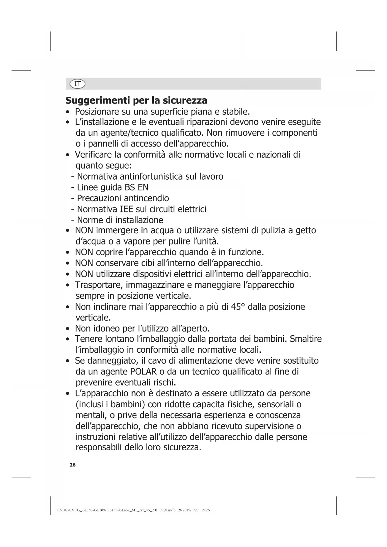 - L’apparacchio non è destinato a essere utilizzato da persone (inclusi i bambini) con ridotte capacita fisiche, sensoriali o mentali, o prive della necessaria esperienza e conoscenza dell’apparecchio, che non abbiano ricevuto supervisione o instruzioni relative all’utilizzo dell’apparecchio dalle persone responsabili dello loro sicurezza. CS102-CS103_GL186-GL189-GL455-GL457_ML_A5_v5_20190920.indb 26 2019/9/20 15:2627