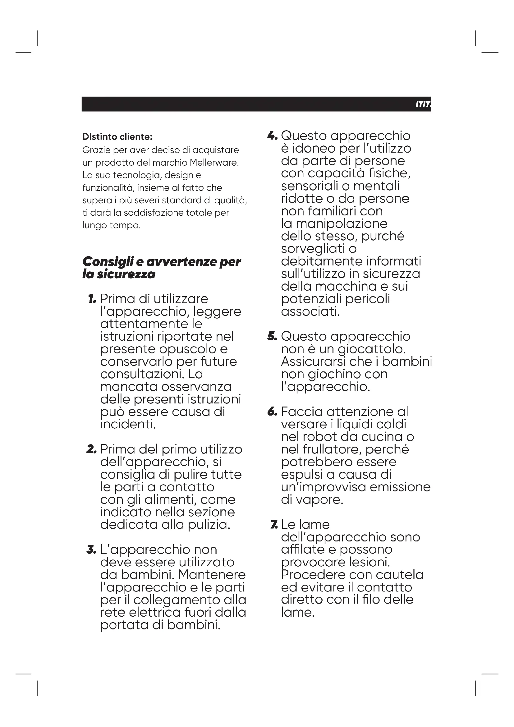 –um die getrennte Sammlung von Elektro- und Elektronikgeräte-Abfall (WEEE) sicherzustellen. Dieses Gerät erfüllt die Richtlinie 2014/35/EU über Niederspannung, die Richtlinie 2014/30/EU über elektromagnetische Verträglichkeit, die Richtlinie 2011/65/EU zur Beschränkung der Verwendung bestimmter gefährlicher Stoe in Elektro- und Elektronikgeräten und die Richtlinie 2009/125/ EG über die Anforderungen an die umweltgerechte Gestaltung energiebetriebener Produkte. Garantie und technischer Service Dieses Produkt wird gemäss der geltenden Gesetzgebung durch die rechtliche Garantie anerkannt und geschützt. Um Ihre Rechte und Interessen geltend zu machen, müssen Sie eines unserer oziellen Servicezentren aufsuchen. Über folgenden Link nden Sie ein Servicezentrum in Ihrer Nähe: www.mellerware.com Sie können auch Informationen einholen, indem Sie uns unter der am Ende dieses Handbuches angegebenen Telefonnummer anrufen. Sie können dieses Benutzerhandbuch und seine Aktualisierungen unter www.mellerware.com DEITITALIANO DIstinto cliente: Grazie per aver deciso di acquistare un prodotto del marchio Mellerware. La sua tecnologia, design e funzionalità, insieme al fatto che supera i più severi standard di qualità, ti darà la soddisfazione totale per lungo tempo. Prima di utilizzare l’apparecchio, leggere attentamente le istruzioni riportate nel presente opuscolo e conservarlo per future consultazioni. La mancata osservanza delle presenti istruzioni può essere causa di incidenti. Prima del primo utilizzo dell’apparecchio, si consiglia di pulire tutte le parti a contatto con gli alimenti, come indicato nella sezione dedicata alla pulizia. L’apparecchio non deve essere utilizzato da bambini. Mantenere l’apparecchio e le parti per il collegamento alla rete elettrica fuori dalla portata di bambini. Consigli e avvertenze per la sicurezza Questo apparecchio è idoneo per l’utilizzo da parte di persone con capacità siche, sensoriali o mentali ridotte o da persone non familiari con la manipolazione dello stesso, purché sorvegliati o debitamente informati sull’utilizzo in sicurezza della macchina e sui potenziali pericoli associati. Questo apparecchio non è un giocattolo. Assicurarsi che i bambini non giochino con l’apparecchio. Faccia attenzione al versare i liquidi caldi nel robot da cucina o nel frullatore, perché potrebbero essere espulsi a causa di un’improvvisa emissione di vapore. Le lame dell’apparecchio sono alate e possono provocare lesioni. Procedere con cautela ed evitare il contatto diretto con il lo delle lame.