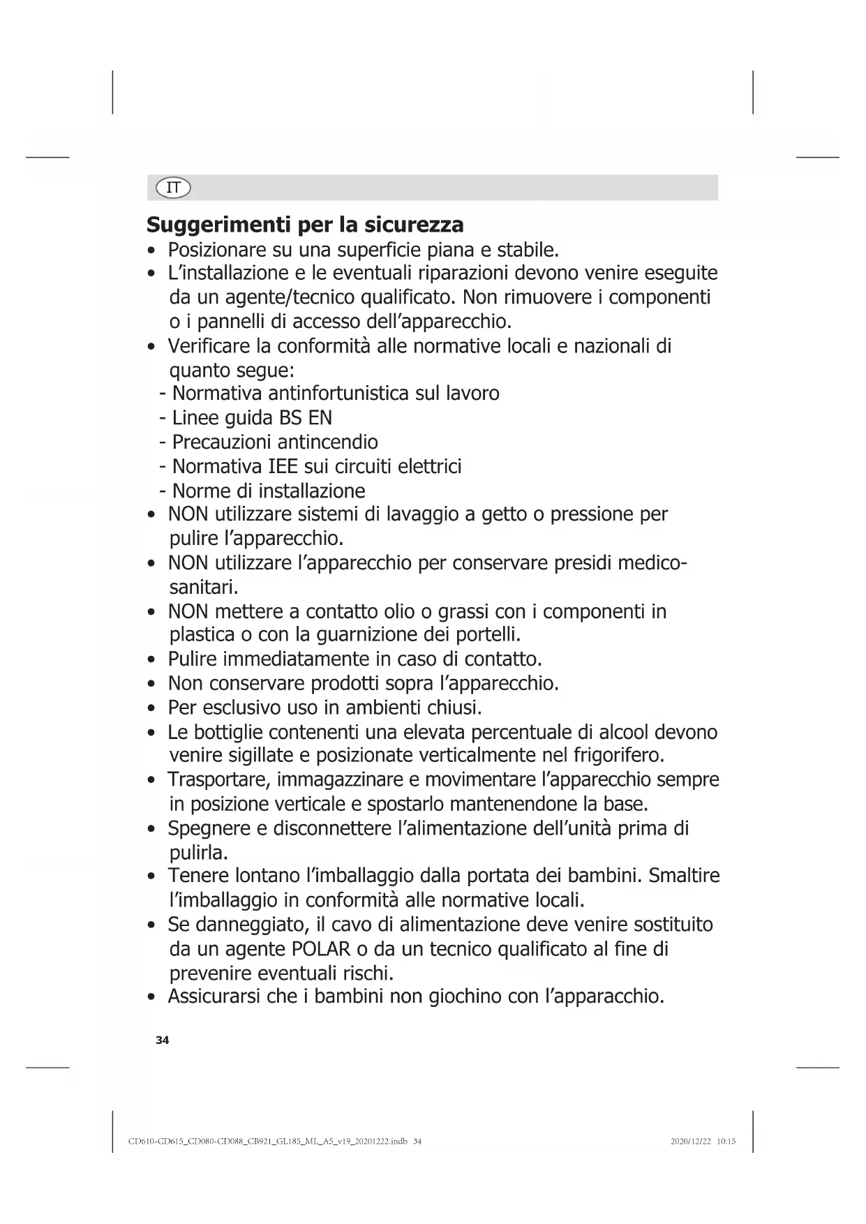 - Attenzione: Non usare apparecchi elettrici all’interno degli scomparti per la conservazione degli alimenti, a meno che siano del tipo consigliato dal produttore. Descrizione del prodotti CD610 - Frigorifero da 150 litri CD611 - Congelatore da 140 litri CD612 - Frigorifero da 400 litri CD613 - Congelatore da 365 litri CD614 - Frigorifero da 600 litri CD615 - Congelatore da 600 litri CD086 - Frigorifero con porta di vetro da 150 litri CD087 - Frigorifero con porta in vetro da 400 litri CD080 - Frigorifero da 150 litri (acciaio inossidabile) CD081 - Congelatore da 140 litri (acciaio inossidabile) CD082 - Frigorifero da 400 litri (acciaio inossidabile) CD083 - Congelatore da 365 litri (acciaio inossidabile) CD084 - Frigorifero da 600 litri (acciaio inossidabile) CD085 - Congelatore da 600 litri (acciaio inossidabile) CD088 - Frigorifero con porta di vetro da 600 litri Congelatore con porta in vetro da 365 litri GL185 - Frigorifero per panetteria da 522 litri Introduzione Leggere con attenzione il presente manuale. La manutenzione e l’utilizzo corretti di questo apparecchio consentiranno di ottenere le massime prestazioni da questo prodotto POLAR. CD610-CD615_CD080-CD088_CB921_GL185_ML_A5_v19_20201222.indb 35CD610-CD615_CD080-CD088_CB921_GL185_ML_A5_v19_20201222.indb 35 2020/12/22 10:152020/12/22 10:1536