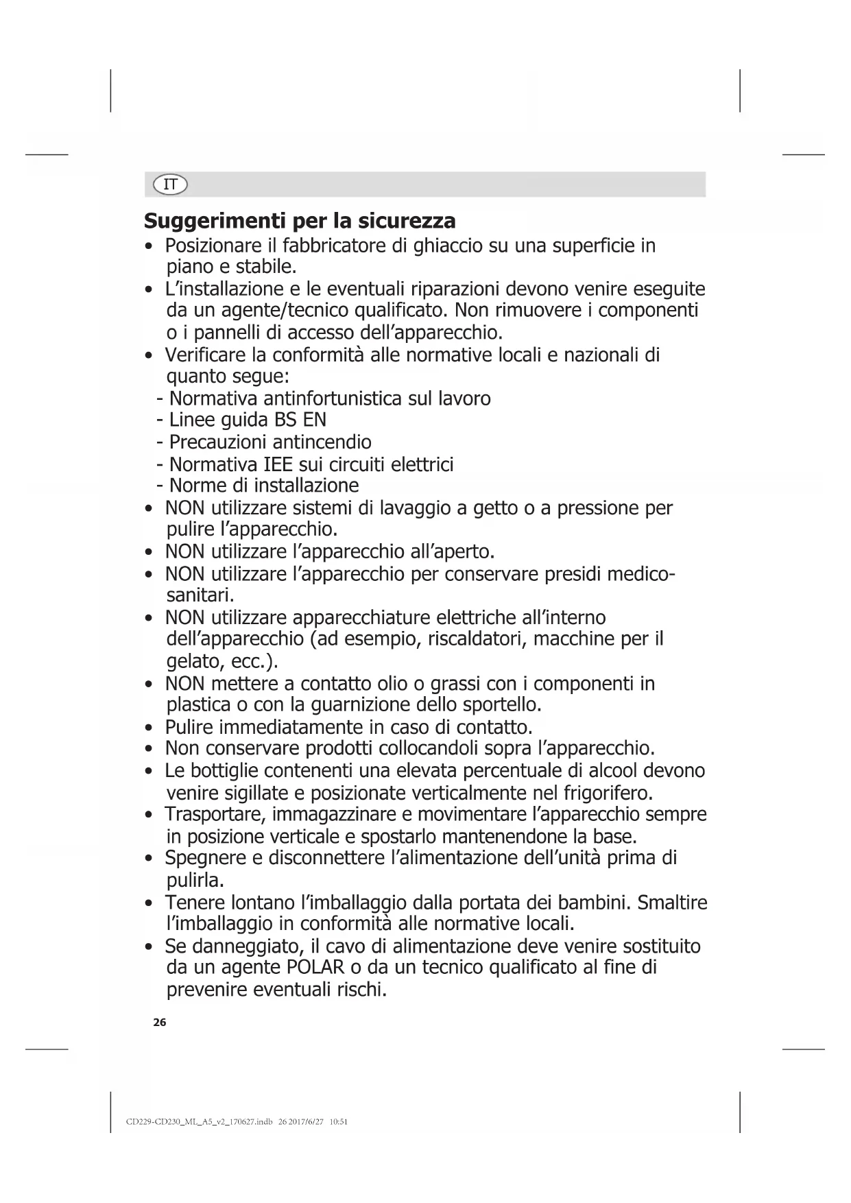 - Se danneggiato, il cavo di alimentazione deve venire sostituito da un agente POLAR o da un tecnico qualificato al fine di prevenire eventuali rischi. CD229-CD230_ML_A5_v2_170627.indb 26 2017/6/27 10:5127