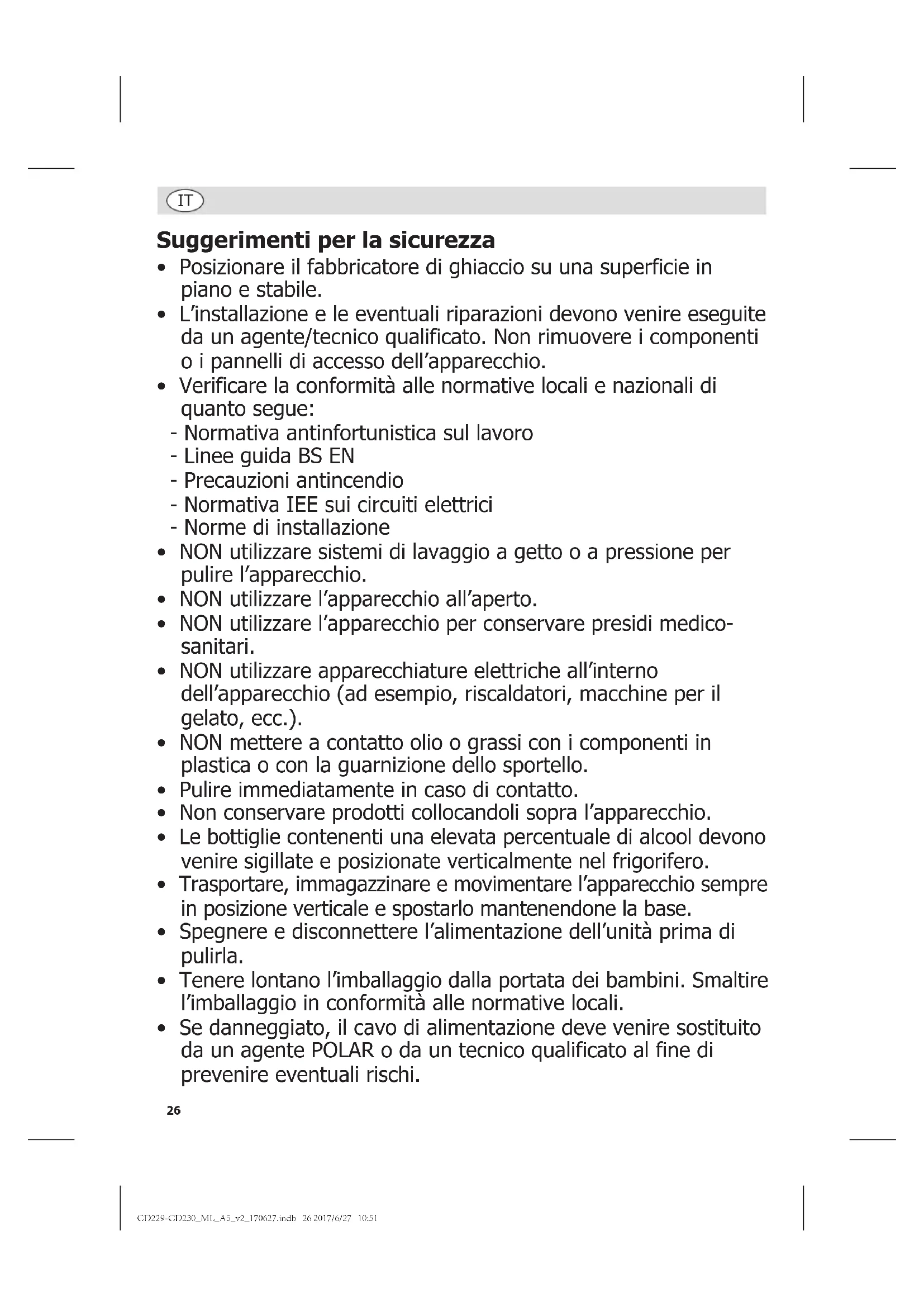 - Se danneggiato, il cavo di alimentazione deve venire sostituito da un agente POLAR o da un tecnico qualificato al fine di prevenire eventuali rischi. CD229-CD230_ML_A5_v2_170627.indb 26 2017/6/27 10:5127