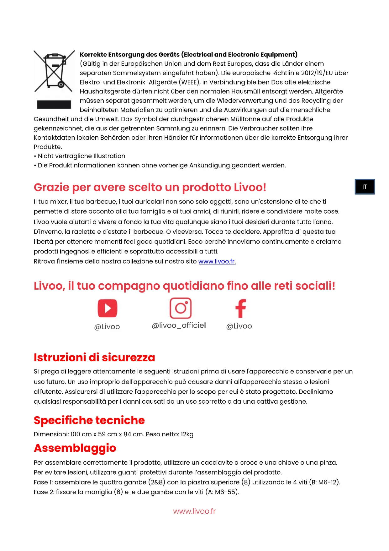 - Die Produktinformationen können ohne vorherige Ankündigung geändert werden. Grazie per avere scelto un prodotto Livoo! Il tuo mixer, il tuo barbecue, i tuoi auricolari non sono solo oggetti, sono un'estensione di te che ti permette di stare acconto alla tua famiglia e ai tuoi amici, di riunirli, ridere e condividere molte cose. Livoo vuole aiutarti a vivere a fondo la tua vita qualunque siano i tuoi desideri durante tutto l'anno. D'inverno, la raclette e d'estate il barbecue. O viceversa. Tocca te decidere. Approfitta di questa tua libertà per ottenere momenti feel good quotidiani. Ecco perché innoviamo continuamente e creiamo prodotti ingegnosi e efficienti e soprattutto accessibili a tutti. Ritrova l'insieme della nostra collezione sul nostro sito www.livoo.fr. Livoo, il tuo compagno quotidiano fino alle reti sociali!