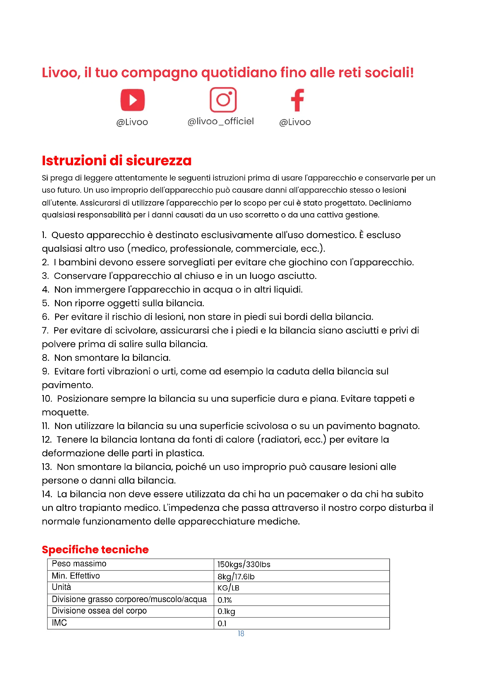 14. La bilancia non deve essere utilizzata da chi ha un pacemaker o da chi ha subito