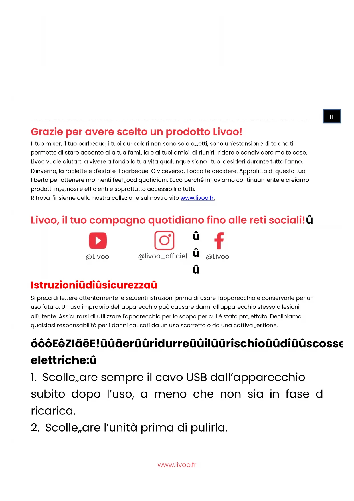 Grazie per avere scelto un prodotto Livoo! Il tuo mixer, il tuo barbecue, i tuoi auricolari non sono solo oggetti, sono un'estensione di te che ti permette di stare acconto alla tua famiglia e ai tuoi amici, di riunirli, ridere e condividere molte cose. Livoo vuole aiutarti a vivere a fondo la tua vita qualunque siano i tuoi desideri durante tutto l'anno. D'inverno, la raclette e d'estate il barbecue. O viceversa. Tocca te decidere. Approfitta di questa tua libertà per ottenere momenti feel good quotidiani. Ecco perché innoviamo continuamente e creiamo prodotti ingegnosi e efficienti e soprattutto accessibili a tutti. Ritrova l'insieme della nostra collezione sul nostro sito www.livoo.fr. Livoo, il tuo compagno quotidiano fino alle reti sociali!