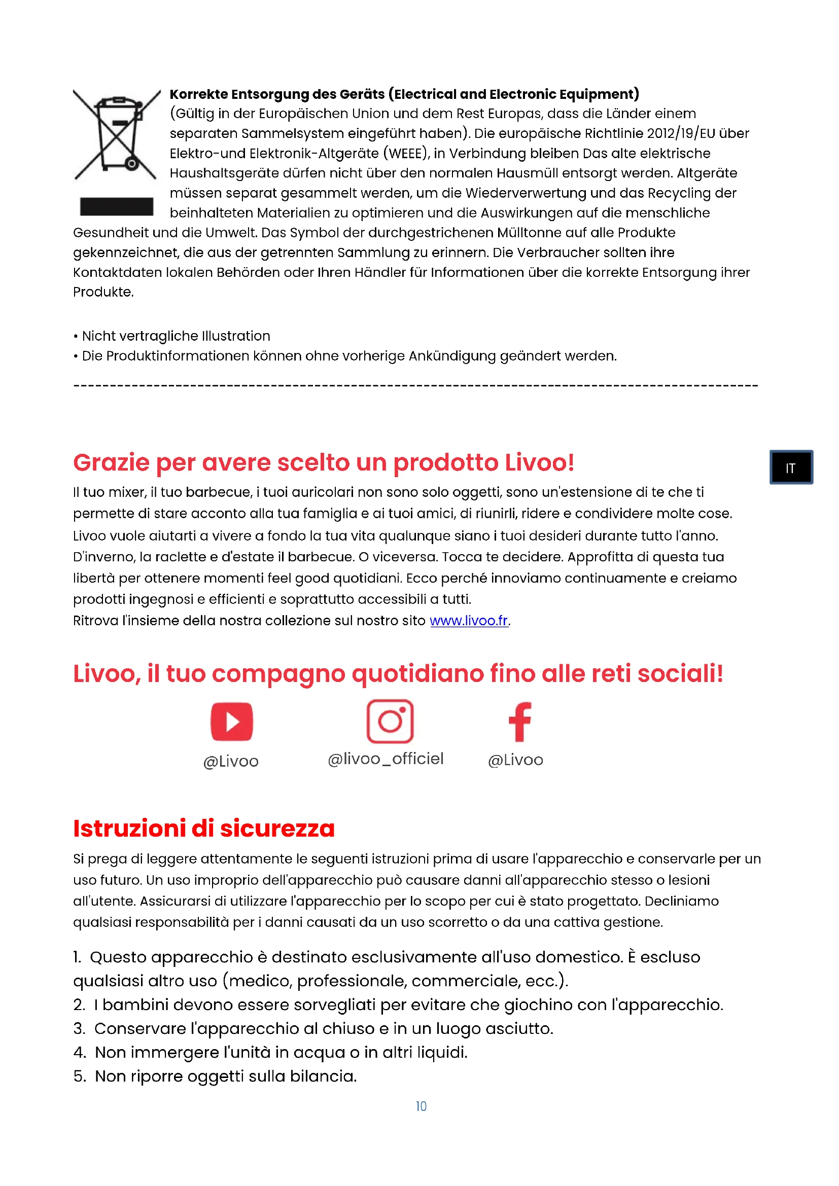 Grazie per avere scelto un prodotto Livoo! Il tuo mixer, il tuo barbecue, i tuoi auricolari non sono solo oggetti, sono un'estensione di te che ti permette di stare acconto alla tua famiglia e ai tuoi amici, di riunirli, ridere e condividere molte cose. Livoo vuole aiutarti a vivere a fondo la tua vita qualunque siano i tuoi desideri durante tutto l'anno. D'inverno, la raclette e d'estate il barbecue. O viceversa. Tocca te decidere. Approfitta di questa tua libertà per ottenere momenti feel good quotidiani. Ecco perché innoviamo continuamente e creiamo prodotti ingegnosi e efficienti e soprattutto accessibili a tutti. Ritrova l'insieme della nostra collezione sul nostro sito www.livoo.fr. Livoo, il tuo compagno quotidiano fino alle reti sociali!