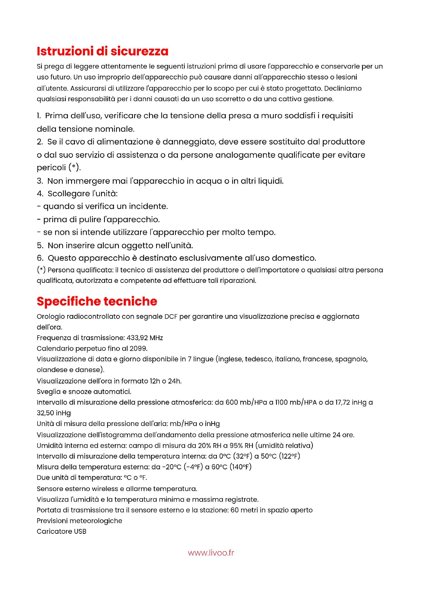 (*) Persona qualificata: il tecnico di assistenza del produttore o dell'importatore o qualsiasi altra persona qualificata, autorizzata e competente ad effettuare tali riparazioni. Specifiche tecniche Orologio radiocontrollato con segnale DCF per garantire una visualizzazione precisa e aggiornata dell'ora. Frequenza di trasmissione: 433,92 MHz Calendario perpetuo fino al 2099. Visualizzazione di data e giorno disponibile in 7 lingue (inglese, tedesco, italiano, francese, spagnolo, olandese e danese). Visualizzazione dell'ora in formato 12h o 24h. Sveglia e snooze automatici. Intervallo di misurazione della pressione atmosferica: da 600 mb/HPa a 1100 mb/HPA o da 17,72 inHg a 32,50 inHg Unità di misura della pressione dell'aria: mb/HPa o inHg Visualizzazione dell'istogramma dell'andamento della pressione atmosferica nelle ultime 24 ore. Umidità interna ed esterna: campo di misura da 20% RH a 95% RH (umidità relativa) Intervallo di misurazione della temperatura interna: da 0°C (32°F) a 50°C (122°F) Misura della temperatura esterna: da -20°C (-4°F) a 60°C (140°F) Due unità di temperatura: °C o °F. Sensore esterno wireless e allarme temperatura. Visualizza l'umidità e la temperatura minima e massima registrate. Portata di trasmissione tra il sensore esterno e la stazione: 60 metri in spazio aperto Previsioni meteorologiche Caricatore USBwww.livoo.fr Alimentazione: