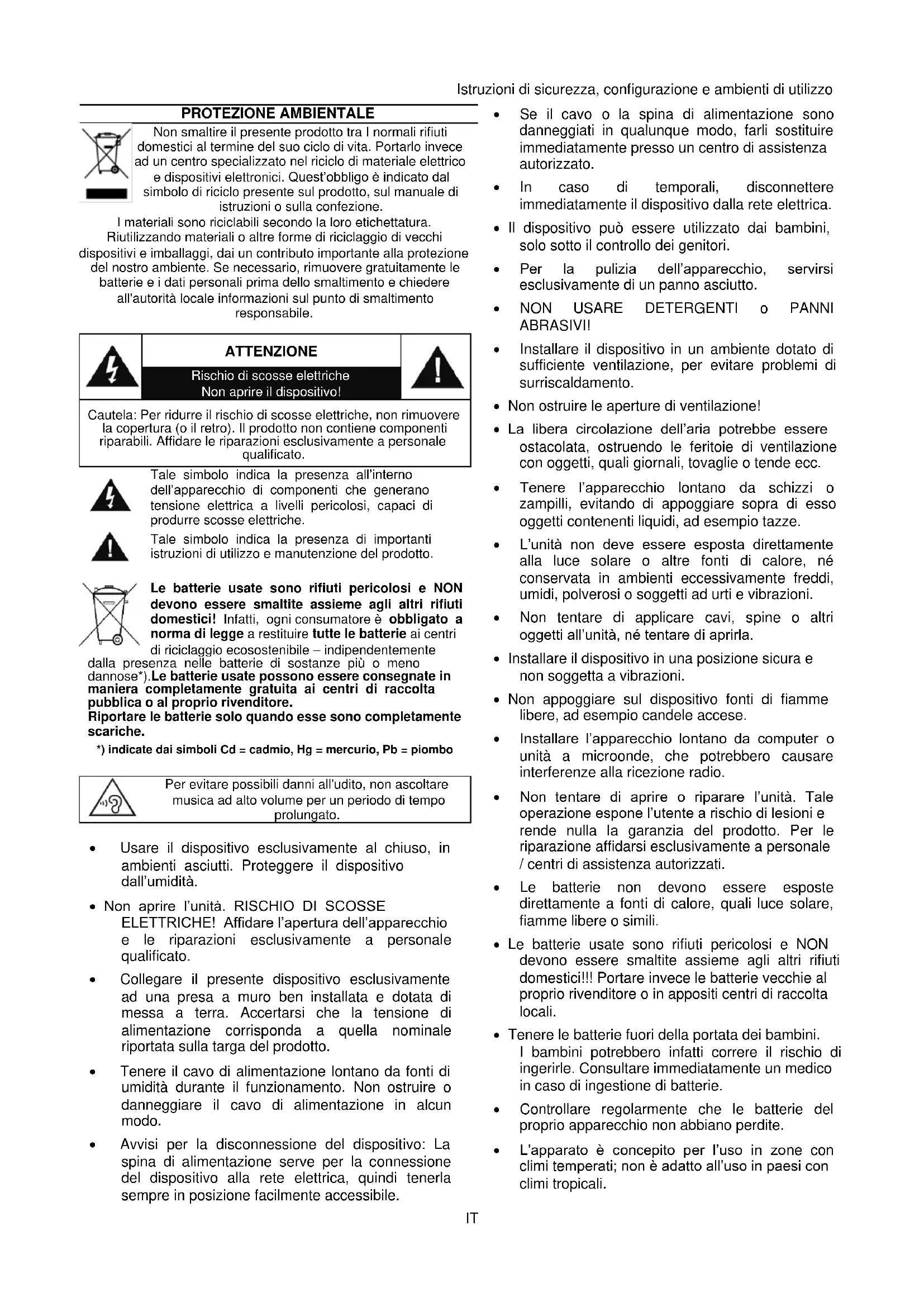 - Non aprire l’unità. RISCHIO DI SCOSSE ELETTRICHE! Affidare l’apertura dell’apparecchio e le riparazioni esclusivamente a personale qualificato.