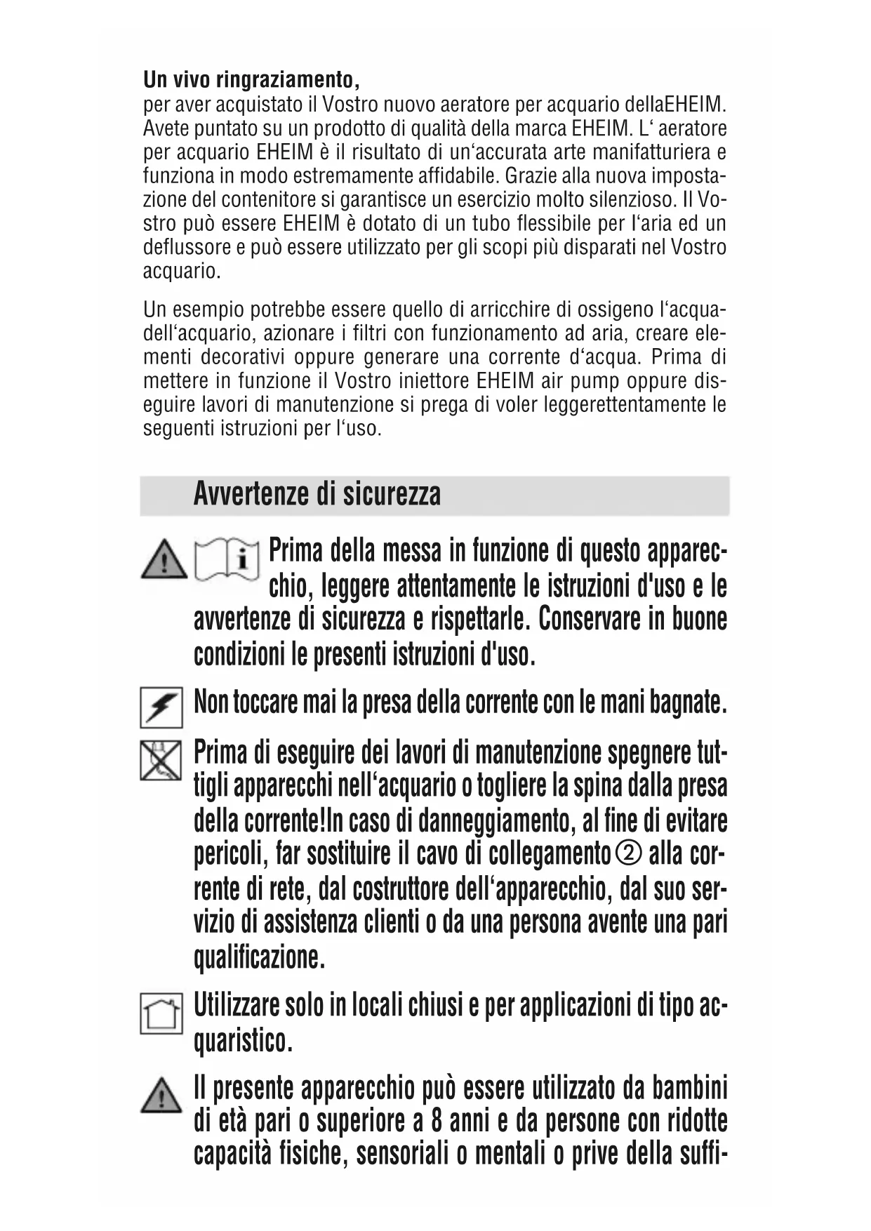 filtskive kan med tiden dækkes til og til- stoppe. Det medfører et forhøjet modtryk, hvorved lufteffekten re- duceres og slitagen af membranen fremskyndes. Udskift derfor re- gelmæssigt filtskiven på EHEIM udstrømmeren. Pleje og rengøring Italiano air pump 100 ( nr. art. 3701) air pump 200 ( nr. art. 3702) air pump 400 ( nr. art. 3704) Modello: vedi targhetta del tipo sul corpo motoreUn vivo ringraziamento, per aver acquistato il Vostro nuovo aeratore per acquario dellaEHEIM. Avete puntato su un prodotto di qualità della marca EHEIM. L‘ aeratore per acquario EHEIM è il risultato di un‘accurata arte manifatturiera e funziona in modo estremamente affidabile. Grazie alla nuova imposta- zione del contenitore si garantisce un esercizio molto silenzioso. Il Vo- stro può essere EHEIM è dotato di un tubo flessibile per l‘aria ed un deflussore e può essere utilizzato per gli scopi più disparati nel Vostro acquario. Un esempio potrebbe essere quello di arricchire di ossigeno l‘acqua- dell‘acquario, azionare i filtri con funzionamento ad aria, creare ele- menti decorativi oppure generare una corrente d‘acqua. Prima di mettere in funzione il Vostro iniettore EHEIM air pump oppure dis- eguire lavori di manutenzione si prega di voler leggerettentamente le seguenti istruzioni per l‘uso. Prima della messa in funzione di questo apparec- chio, leggere attentamente le istruzioni d'uso e le avvertenze di sicurezza e rispettarle. Conservare in buone condizioni le presenti istruzioni d'uso. Non toccare mai la presa della corrente con le mani bagnate. Prima di eseguire dei lavori di manutenzione spegnere tut- tigli apparecchi nell‘acquario o togliere la spina dalla presa della corrente!In caso di danneggiamento, al fine di evitare pericoli, far sostituire il cavo di collegamento