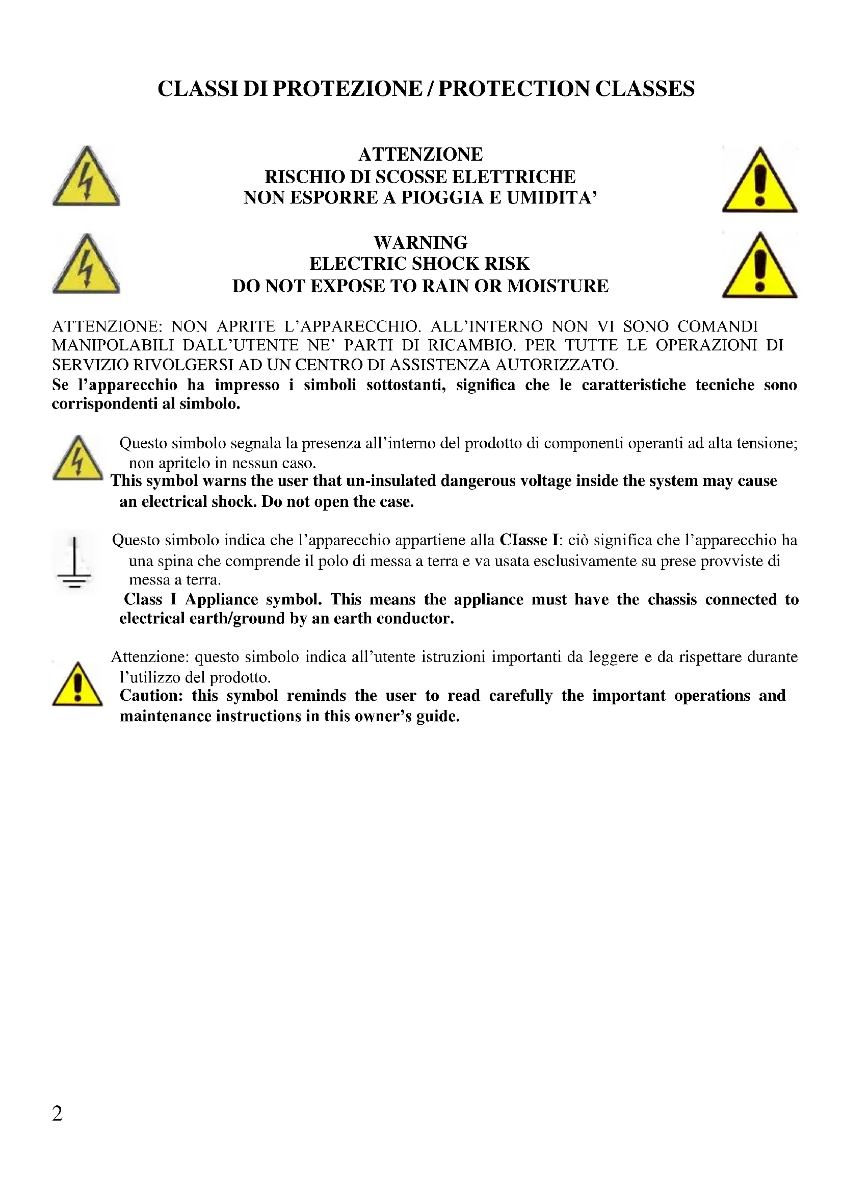 DO NOT EXPOSE TO RAIN OR MOISTURE ATTENZIONE: NON APRITE L’APPARECCHIO. ALL’INTERNO NON VI SONO COMANDI MANIPOLABILI DALL’UTENTE NE’ PARTI DI RICAMBIO. PER TUTTE LE OPERAZIONI DI SERVIZIO RIVOLGERSI AD UN CENTRO DI ASSISTENZA AUTORIZZATO. Se l’apparecchio ha impresso i simboli sottostanti, significa che le caratteristiche tecniche sono corrispondenti al simbolo. Questo simbolo segnala la presenza all’interno del prodotto di componenti operanti ad alta tensione; non apritelo in nessun caso. This symbol warns the user that un-insulated dangerous voltage inside the system may cause an electrical shock. Do not open the case. Questo simbolo indica che l’apparecchio appartiene alla CIasse I: ciò significa che l’apparecchio ha una spina che comprende il polo di messa a terra e va usata esclusivamente su prese provviste di messa a terra. Class I Appliance symbol. This means the appliance must have the chassis connected to electrical earth/ground by an earth conductor. Attenzione: questo simbolo indica all’utente istruzioni importanti da leggere e da rispettare durante l’utilizzo del prodotto. Caution: this symbol reminds the user to read carefully the important operations and maintenance instructions in this owner’s guide.AVVERTENZE DI SICUREZZA Di seguito sono riportate importanti indicazioni riguardanti l’installazione, l’uso e la manutenzione; conservare con cura questo libretto per ogni ulteriore consultazione; utilizzare il prodotto solo nel modo indicato dal presente libretto di istruzioni; ogni altro uso è da considerare improprio e pericoloso; perciò il costruttore non può essere considerato responsabile nel caso in cui vi siano danni derivanti da usi impropri, erronei ed irragionevoli. Prima dell’uso verificare l'integrità dell'apparecchio: in caso di dubbio non utilizzarlo e rivolgersi all’assistenza. Non lasciare gli elementi dell'imballaggio (sacchetti in plastica, polistirolo espanso, chiodi, graffette, ecc.) alla portata dei bambini in quanto sono potenziali fonti di pericolo; inoltre, ricordiamo che questi, devono essere oggetto di raccolta differenziata. Accertarsi che i dati di targa siano compatibili con quelli della rete elettrica; l'installazione deve essere effettuata in base alle istruzioni del costruttore considerando la potenza massima indicata in targa; un’errata installazione può causare danni a persone, animali o cose, per i quali il costruttore non può essere considerato responsabile. Se fosse necessario l’uso di adattatori, prese multiple e prolunghe utilizzare quelli conformi alle vigenti norme di sicurezza; non superare i limiti di assorbimento indicati su adattatore e/o prolunghe, nonché quello di massima potenza marcato sull'adattatore multiplo. Non lasciare l'apparecchio inutilmente inserito; meglio staccare la spina dalla rete di alimentazione quando l'apparecchio non viene utilizzato. Scollegare sempre l’apparecchio dall’alimentazione se lasciato incustodito. Le operazioni di pulizia devono essere effettuate dopo aver staccato la spina.Qualora l’apparecchio sia fuori uso e si sia deciso di non ripararlo, si raccomanda di renderlo inutilizzabile tagliando il cavo di alimentazione. - Non avvicinare il cavo di alimentazione a oggetti taglienti o a superfici calde e non tirarlo per staccare la spina. Non lasciarlo penzolare dal piano di lavoro dove un bambino potrebbe afferrarlo. Non utilizzare il prodotto in caso di danni al cavo di alimentazione, alla spina o in caso di cortocircuiti; fare riparare il prodotto da un centro di assistenza autorizzato. - Non esporre il prodotto a condizioni atmosferiche dannose come pioggia, umidità, gelo, ecc. Conservarlo in luoghi asciutti. Non maneggiare o toccare il prodotto con mani bagnate o a piedi nudi. - Questo apparecchio può essere utilizzato da bambini dagli 8 anni in su e da persone con ridotte capacità fisiche, sensoriali o mentali o con mancanza di esperienza o conoscenza se a loro è stata assicurata un’adeguata sorveglianza oppure se hanno ricevuto istruzioni circa l’uso in sicurezza dell’apparecchio e compreso i rischi associati; le operazioni di pulizia e di manutenzione non devono essere effettuate da bambini a meno che non abbiano più di 8 anni e siano sorvegliati. - I bambini non devono giocare con l’apparecchio. - Tenere il prodotto ed il cavo di alimentazione fuori dalla portata dei bambini sotto 8 anni. ATTENZIONE: il prodotto ha una funzione riscaldante. Le superfici possono sviluppare alte temperature. Dato che la percezione della temperatura è diversa per ogni persona, utilizzare l’apparecchio con cautela. Toccare solo le superfici progettate per essere toccate. Se il cavo di alimentazione è danneggiato, o in caso di guasto e/o di cattivo funzionamento non manomettere l'apparecchio. L'eventuale riparazione deve essere effettuata dal costruttore o dal suo servizio assistenzatecnica o comunque da una persona con qualifica similare, in modo da prevenire ogni rischio. Il mancato rispetto di quanto sopra può compromettere la sicurezza dell'apparecchio e far decadere i termini di garanzia. - Questo apparecchio è progettato per uso domestico o applicazioni simili come: cucine per il personale in negozi, uffici o altri luoghi di lavoro, per i clienti in hotel, motel, bed & breakfast o residence. - L’apparecchio non è progettato per essere usato attraverso timer esterni o telecomandi. Prima di ogni utilizzo svolgere il cavo di alimentazione. - Non sottoporre il prodotto ad urti, potrebbero danneggiarlo. Utilizzare solo ricambi ed accessori originali e compatibili. - Non utilizzare sotto o accanto a materiali infiammabili come le tende, fonti di calore, zone fredde e vapore.