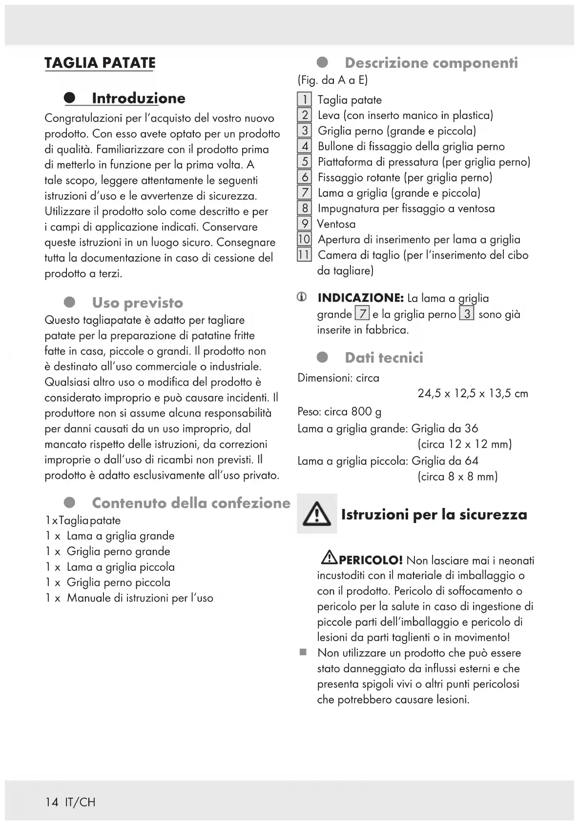 sono già inserite in fabbrica. Dati tecnici Dimensioni: circa 24,5 x 12,5 x 13,5 cm Peso: circa 800 g Lama a griglia grande: Griglia da 36 (circa 12 x 12 mm) Lama a griglia piccola: Griglia da 64 (circa 8 x 8 mm) Istruzioni per la sicurezza mPERICOLO! Non lasciare mai i neonati incustoditi con il materiale di imballaggio o con il prodotto. Pericolo di soffocamento o pericolo per la salute in caso di ingestione di piccole parti dell‘imballaggio e pericolo di lesioni da parti taglienti o in movimento! Non utilizzare un prodotto che può essere stato danneggiato da influssi esterni e che presenta spigoli vivi o altri punti pericolosi che potrebbero causare lesioni.15 IT/CH L‘uso del prodotto da parte di bambini o di persone che, a causa delle loro capacità fisiche, mentali o motorie, non sono in grado di utilizzare il prodotto in modo sicuro, va consentito solo sotto sorveglianza. Utilizzare il prodotto solo per il taglio delle patate. Un sovraccarico causato dal taglio di alimenti troppo duri o troppo compatti può causare danni. Tenere il prodotto in un luogo sicuro. Evitare la polvere, lo sporco o il contatto con sostanze chimiche. Forti sbalzi di temperatura o l‘esposizione al calore possono causare problemi o danni (luce solare diretta, forni, radiatori, ecc.). Non utilizzare il prodotto se danneggiato. Prima del primo utilizzo Rimuovere i materiali di imballaggio e smaltirli come previsto. Pulire il prodotto e gli accessori (vedere la sezione „Pulizia e manutenzione“). mAVVERTENZA! Pericolo di lesioni! Le lame sono affilate. Montaggio INDICAZIONE: La lama a griglia grande