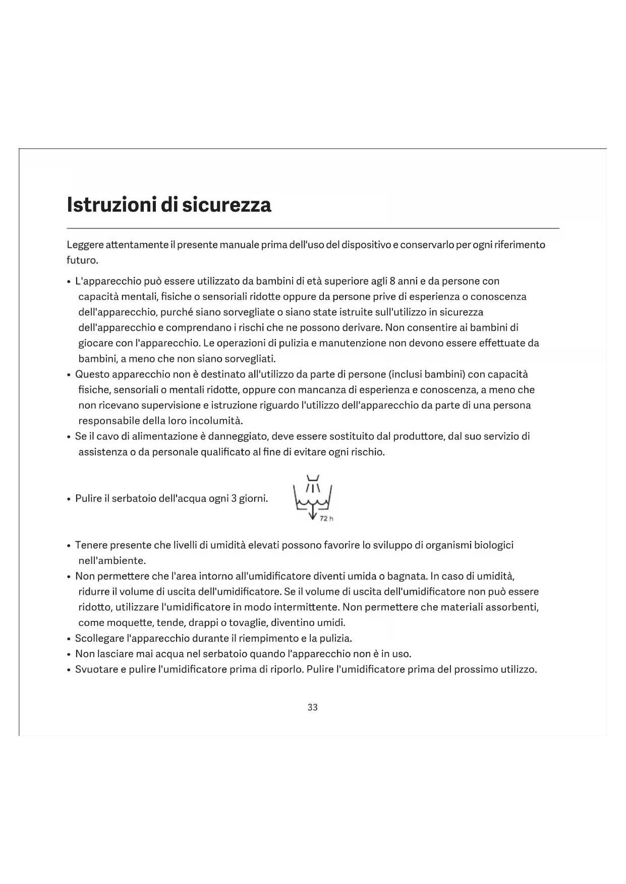- Pulire il serbatoio dell'acqua ogni 3 giorni.