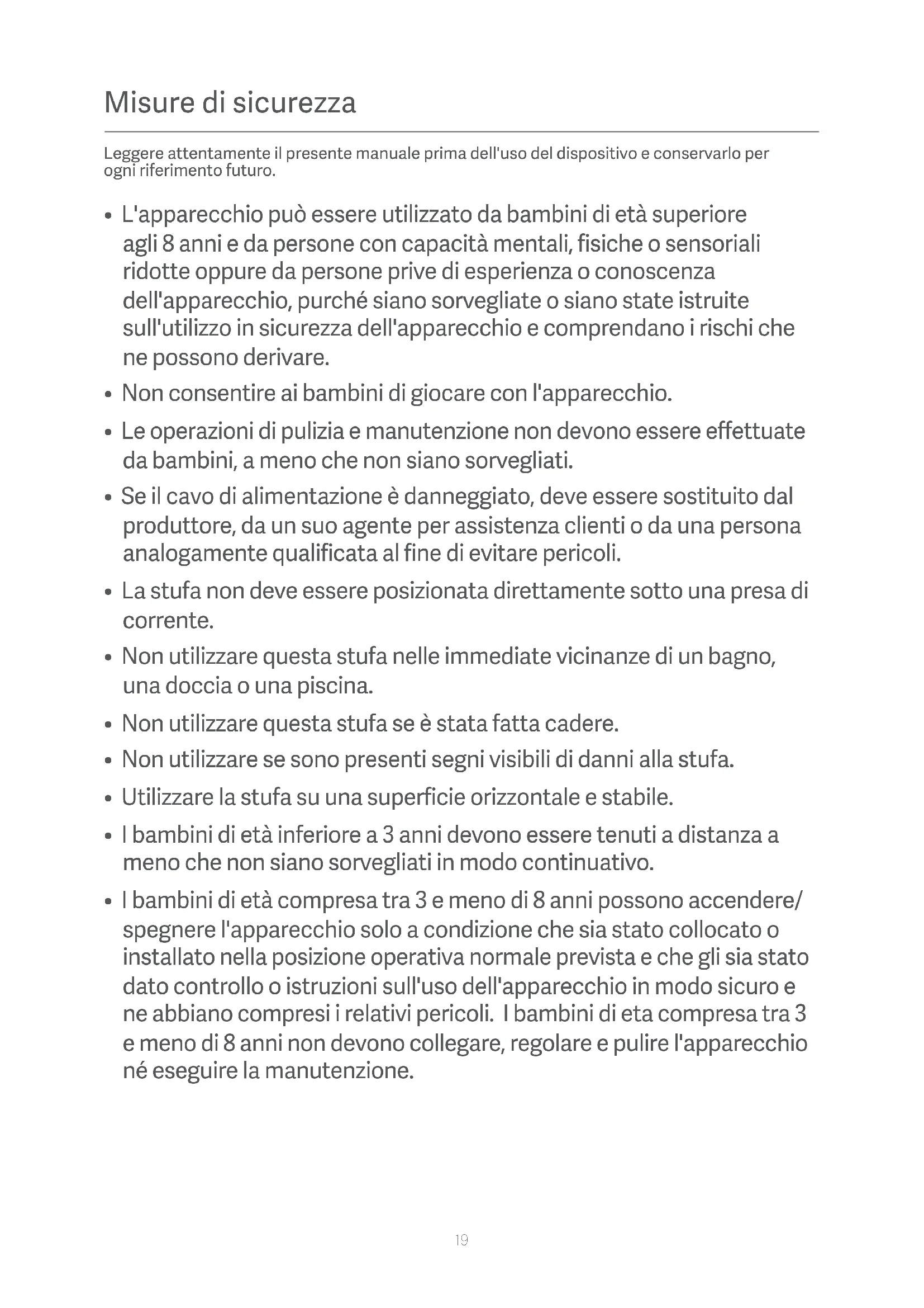 - I bambini di età compresa tra 3 e meno di 8 anni possono accendere/ spegnere l'apparecchio solo a condizione che sia stato collocato o installato nella posizione operativa normale prevista e che gli sia stato dato controllo o istruzioni sull'uso dell'apparecchio in modo sicuro e ne abbiano compresi i relativi pericoli. I bambini di eta compresa tra 3 e meno di 8 anni non devono collegare, regolare e pulire l'apparecchio né eseguire la manutenzione. Misure di sicurezza Leggere attentamente il presente manuale prima dell'uso del dispositivo e conservarlo per ogni riferimento futuro.20 Alcune parti di questo prodotto possono diventare molto calde e causare ustioni. Occorre prestare particolare attenzione in presenza di bambini e persone vulnerabili. ATTENZIONE AVVERTENZE