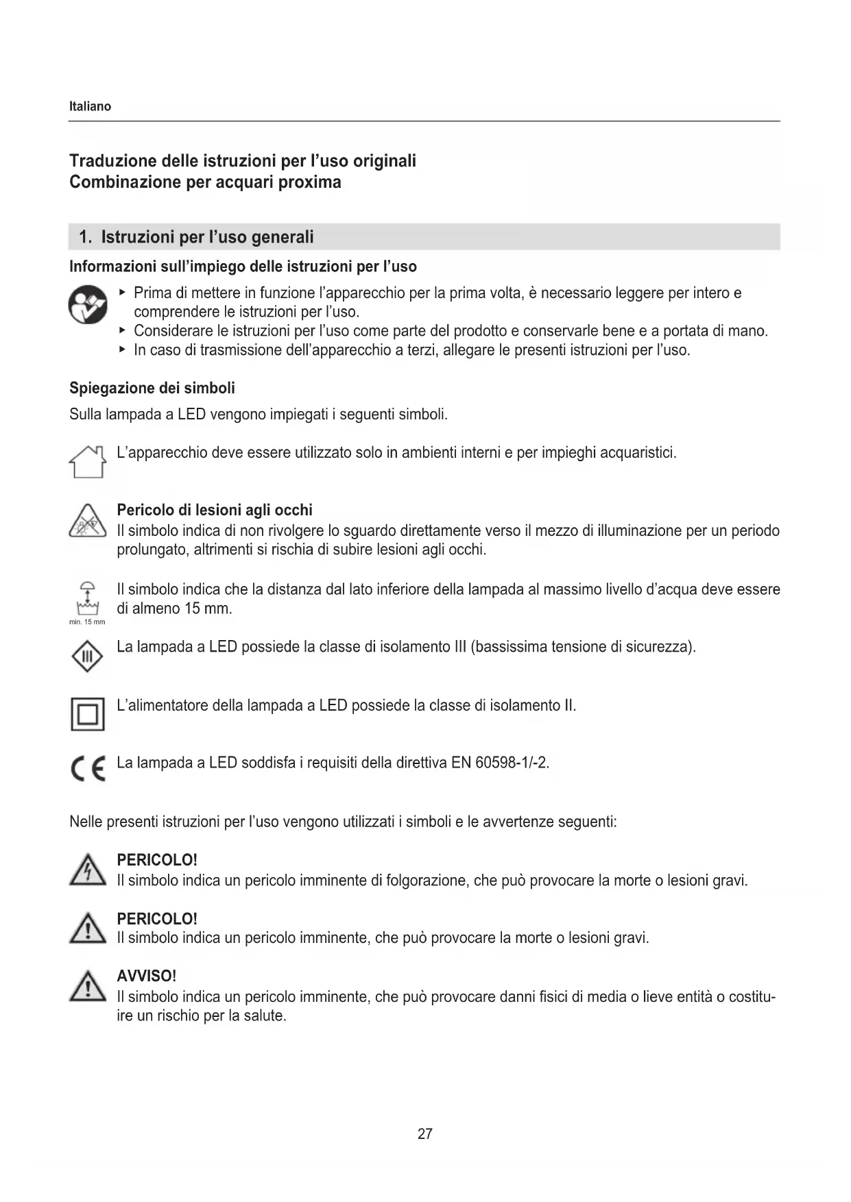 Informazioni sull’impiego delle istruzioni per l’uso ▶ Prima di mettere in funzione l’apparecchio per la prima volta, è necessario leggere per intero e comprendere le istruzioni per l’uso. ▶ Considerare le istruzioni per l’uso come parte del prodotto e conservarle bene e a portata di mano. ▶ In caso di trasmissione dell’apparecchio a terzi, allegare le presenti istruzioni per l’uso. Spiegazione dei simboli Sulla lampada a LED vengono impiegati i seguenti simboli. L’apparecchio deve essere utilizzato solo in ambienti interni e per impieghi acquaristici. Pericolo di lesioni agli occhi Il simbolo indica di non rivolgere lo sguardo direttamente verso il mezzo di illuminazione per un periodo prolungato, altrimenti si rischia di subire lesioni agli occhi. Il simbolo indica che la distanza dal lato inferiore della lampada al massimo livello d’acqua deve essere di almeno 15 mm. La lampada a LED possiede la classe di isolamento III (bassissima tensione di sicurezza). L’alimentatore della lampada a LED possiede la classe di isolamento II. La lampada a LED soddisfa i requisiti della direttiva EN 60598-1/-2. Nelle presenti istruzioni per l’uso vengono utilizzati i simboli e le avvertenze seguenti: PERICOLO! Il simbolo indica un pericolo imminente di folgorazione, che può provocare la morte o lesioni gravi. PERICOLO! Il simbolo indica un pericolo imminente, che può provocare la morte o lesioni gravi. AVVISO! Il simbolo indica un pericolo imminente, che può provocare danni sici di media o lieve entità o costitu- ire un rischio per la salute. min. 15 mm28 Italiano ATTENZIONE! Il simbolo avverte del pericolo di danni materiali. Avvertenza con informazioni e suggerimenti utili. Convenzioni di rappresentazione: Rimando a una gura, qui rimando alla gura A Viene richiesta un’azione da parte vostra.