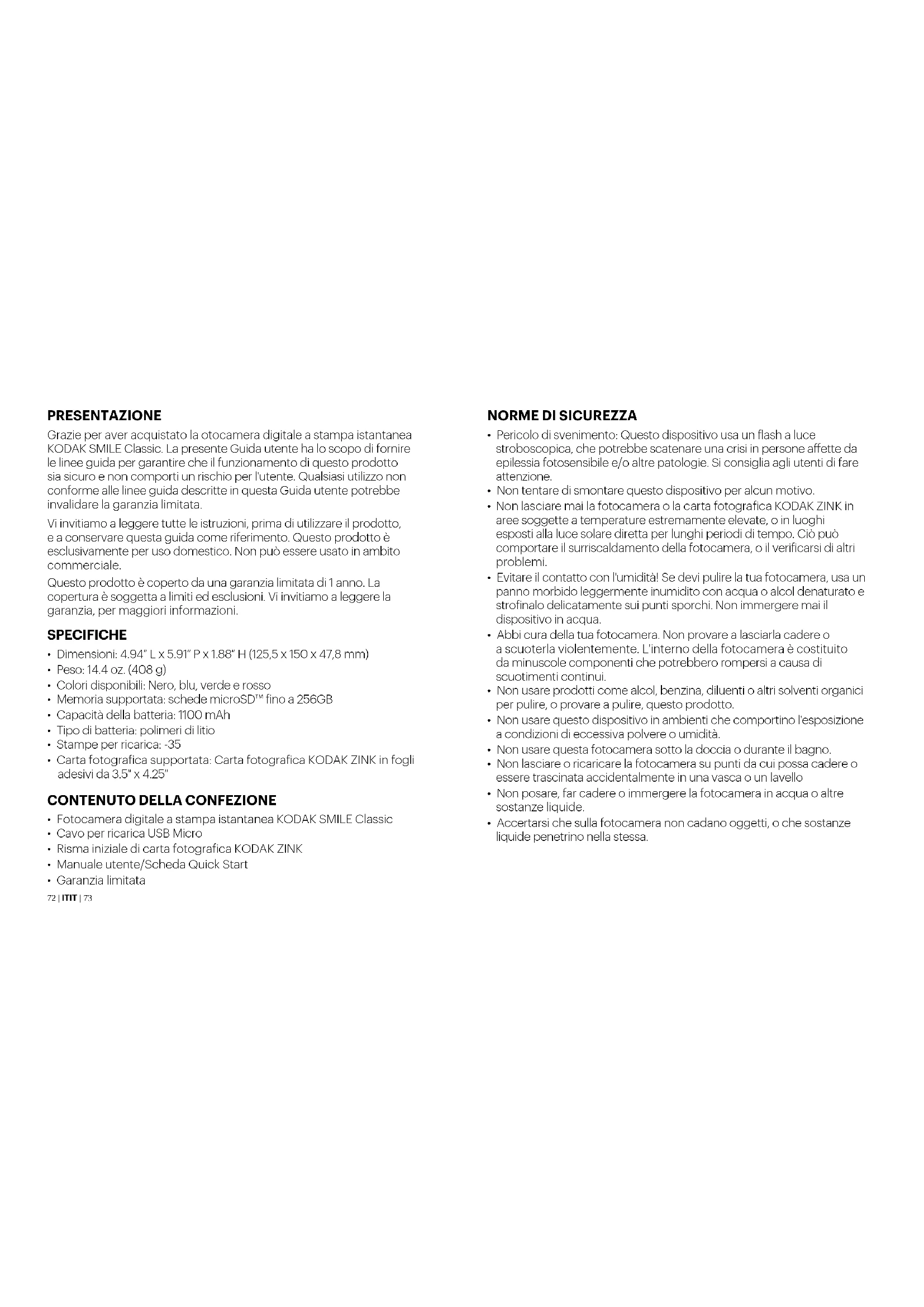 NELLA MISURA NON VIETATA DALLA LEGGE, QUESTA GARANZIA È DA INTENDERSI ESCLUSIVA E SOSTITUTIVA DI TUTTE LE ALTRE GARANZIE, SIANO ESSE VERBALI, SCRITTE, OBBLIGATORIE, ESPRESSE O IMPLICITE, FATTE SALVE LE GARANZIE ESPRESSE CONTEMPLATE IN QUESTA DICHIARAZIONE DI GARANZIA LIMITATA. NELLA MISURA NON VIETATA DALLA LEGGE, NOI NON RICONOSCIAMO TUTTE LE ALTRE GARANZIE, SIANO ESSE ESPRESSE O IMPLICITE, OBBLIGATORIE O ALTRO, INCLUSE, SENZA LIMITAZIONI, LE GARANZIE DI COMMERCIABILITÀ E ADEGUATEZZA A PARTICOLARI FINALITÀ. ALCUNI STATI NON AMMETTONO IL DISCONOSCIMENTO DI GARANZIE IMPLICITE, PERTANTO QUESTO DOCUMENTO POTREBBE NON ESSERE APPLICABILE A OGNI UTENTE. NELLA MISURA IN CUI TALI GARANZIE NON POSSONO ESSERE DISCONOSCIUTE IN VIRTÙ DI LEGGI VIGENTI NELLA SUA GIURISDIZIONE, NOI LIMITIAMO LA VALIDITÀ E I RIMEDI SANCITI DALLE STESSE ALLA VALIDITÀ DI QUESTA GARANZIA ESPRESSA E LIMITATA.84 | IT IT | 85 LA NOSTRA RESPONSABILITÀ IN MERITO A PRODOTTI DIFETTOSI È LIMITATA ALLA RIPARAZIONE, SOSTITUIZIONE O AL RIMBORSO, NELLE MODALITÀ DESCRITTE A PIÈ DI PAGINA DI QUESTA DICHIARAZIONE DI GARANZIA. CHI PUÒ RICORRERE A QUESTA GARANZIA? C&A Marketing, Inc. domiciliata in 114 Tived Lane East, Edison, NJ (in prosieguo la “Società”) estende questa garanzia limitata solo al cliente che ha eettivamente acquistato il prodotto (in prosieguo il “Cliente”). Questa garanzia non viene estesa ai proprietari successivi o agli altri destinatari del prodotto. COSA COPRE QUESTA GARANZIA? Questa garanzia limitata copre i difetti nei materiali e di fabbricazione della fotocamera digitale a stampa istantanea KODAK SMILE Classic (il "prodotto") nel corso del periodo di validità della garanzia, come di seguito speciicato. COSA NON COPRE QUESTA GARANZIA? Questa garanzia limitata non copre danni dovuti a: (a) trasporto; (b) stivaggio/immagazzinamento; (c) uso improprio; (d) mancato rispetto delle istruzioni del prodotto o mancata manutenzione preventiva; (e) modiiche; (f) riparazioni non autorizzate; (g) normale usura; (h) cause esterne, come incidenti, abusi o altre azioni o eventi al di fuori del nostro ragionevole controllo. QUAL È IL PERIODO DI COPERTURA? La validità di questa garanzia limitata decorre dalla data di acquisto e ha la durata di un anno (in prosieguo “Periodo di garanzia”). Il Periodo di garanzia non viene prorogato a seguito di interventi di riparazione o sostituzione del prodotto. Noi ci riserviamo la facoltà di modiicare la disponibilità di questa garanzia limitata a nostra discrezione; le modiiche non avranno eetto retroattivo. QUALI SONO I RIMEDI PREVISTI DA QUESTA GARANZIA? Relativamente ai prodotti che presentino difetti nel corso del Periodo di garanzia, a nostra esclusiva discrezione provvederemo a: (a) riparare o sostituire il prodotto difettoso (o la parte difettosa) gratuitamente; (b) rimborsare il prezzo di acquisto del prodotto difettoso, nel caso non fosse possibile sostituirlo con un altro. COME È POSSIBILE OTTENERE INTERVENTI IN GARANZIA? Per ottenere interventi in garanzia, è necessario contattarci telefonicamente al numero 8445161539 o via email all’indirizzo kodak@camarketing.com durante il Periodo di garanzia, e richiedere il numero di autorizzazione alla restituzione della merce (ossia il numero “DMA”). In assenza di un numero DMA non verrà erogato alcun servizio di garanzia e le spese di restituzione saranno a carico del Cliente, ossia dell’acquirente. La Società si farà carico delle spese di spedizione dei prodotti sostitutivi.86 | IT IT | 87 kodakphotoplus.com Il marchio, il logo e il vestito commerciale Kodak sono utilizzati su licenza di Eastman Kodak Company. Android è un marchio di Google LLC. IOS è un marchio di Cisco negli Stati Uniti e in altri paesi e viene utilizzato su licenza. Bluetooth è un marchio di Bluetooth SIG, Inc. USA. Google Play è un marchio di Google LLC. Apple e App Store sono marchi commerciali di Apple Inc. negli Stati Uniti e in altri Paesi. Tutti gli altri prodotti, nomi di marchi, nomi di società e loghi sono marchi dei rispettivi proprietari, utilizzati solo per identificare i loro rispettivi prodotti e non intendono connotare alcuna sponsorizzazione, approvazione o approvazione. Distribuito da: C&A Marketing, Inc., 114 Tived Lane East, Edison, NJ 08837, USA C&A Marketing UK LTD, 167 Hermitage Road, Crusader Industrial Estate, London N4 1LZ, UK ©2019. Tutti i diritti riservati. Prodotto in Cina.