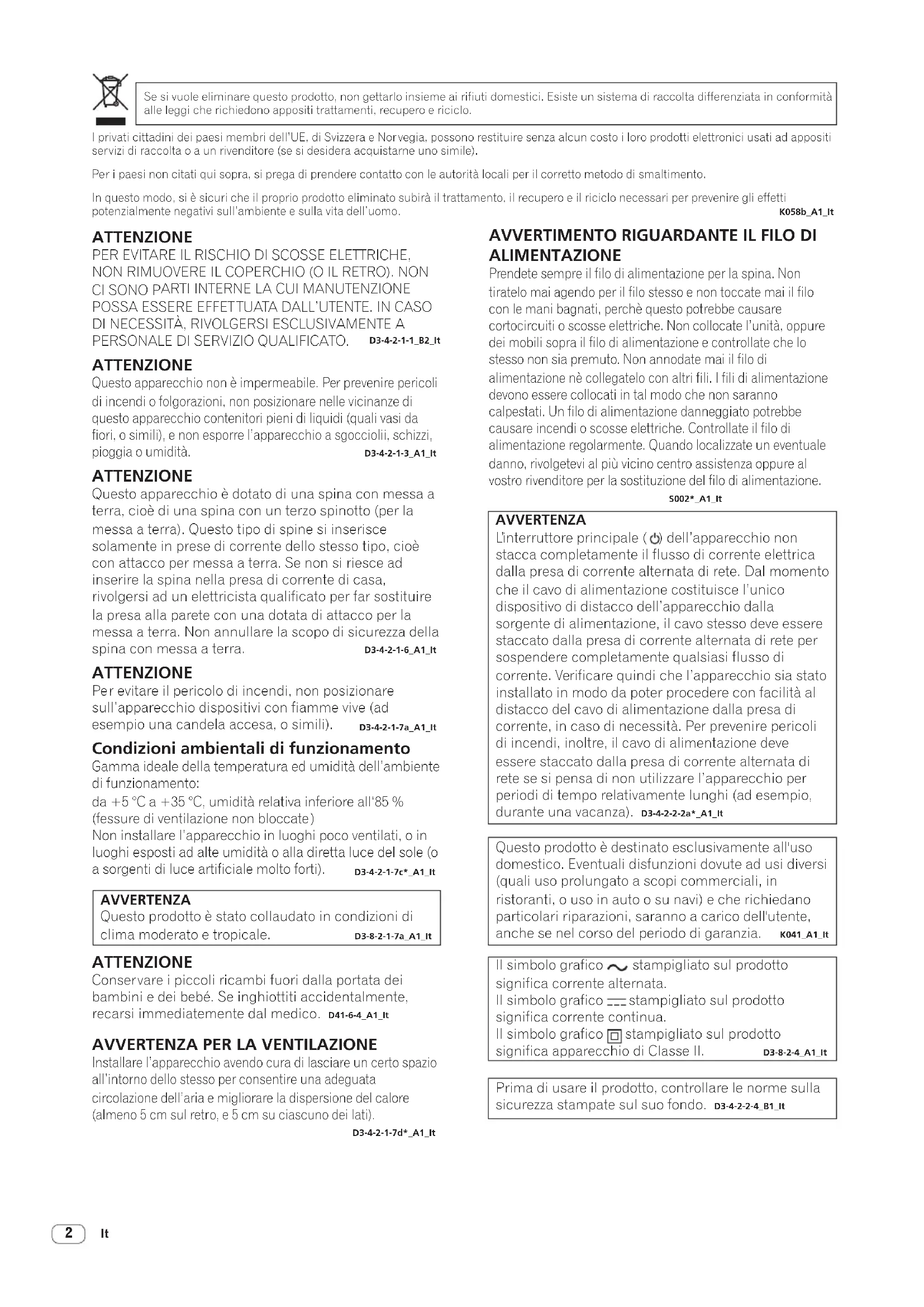 ALIMENTAZIONE Prendete sempre il filo di alimentazione per la spina. Non tiratelo mai agendo per il filo stesso e non toccate mai il filo con le mani bagnati, perchè questo potrebbe causare cortocircuiti o scosse elettriche. Non collocate l’unità, oppure dei mobili sopra il filo di alimentazione e controllate che lo stesso non sia premuto. Non annodate mai il filo di alimentazione nè collegatelo con altri fili. I fili di alimentazione devono essere collocati in tal modo che non saranno calpestati. Un filo di alimentazione danneggiato potrebbe causare incendi o scosse elettriche. Controllate il filo di alimentazione regolarmente. Quando localizzate un eventuale danno, rivolgetevi al più vicino centro assistenza oppure al vostro rivenditore per la sostituzione del filo di alimentazione. S002*_A1_It Prima di usare il prodotto, controllare le norme sulla sicurezza stampate sul suo fondo. D3-4-2-2-4_B1_It AVVER