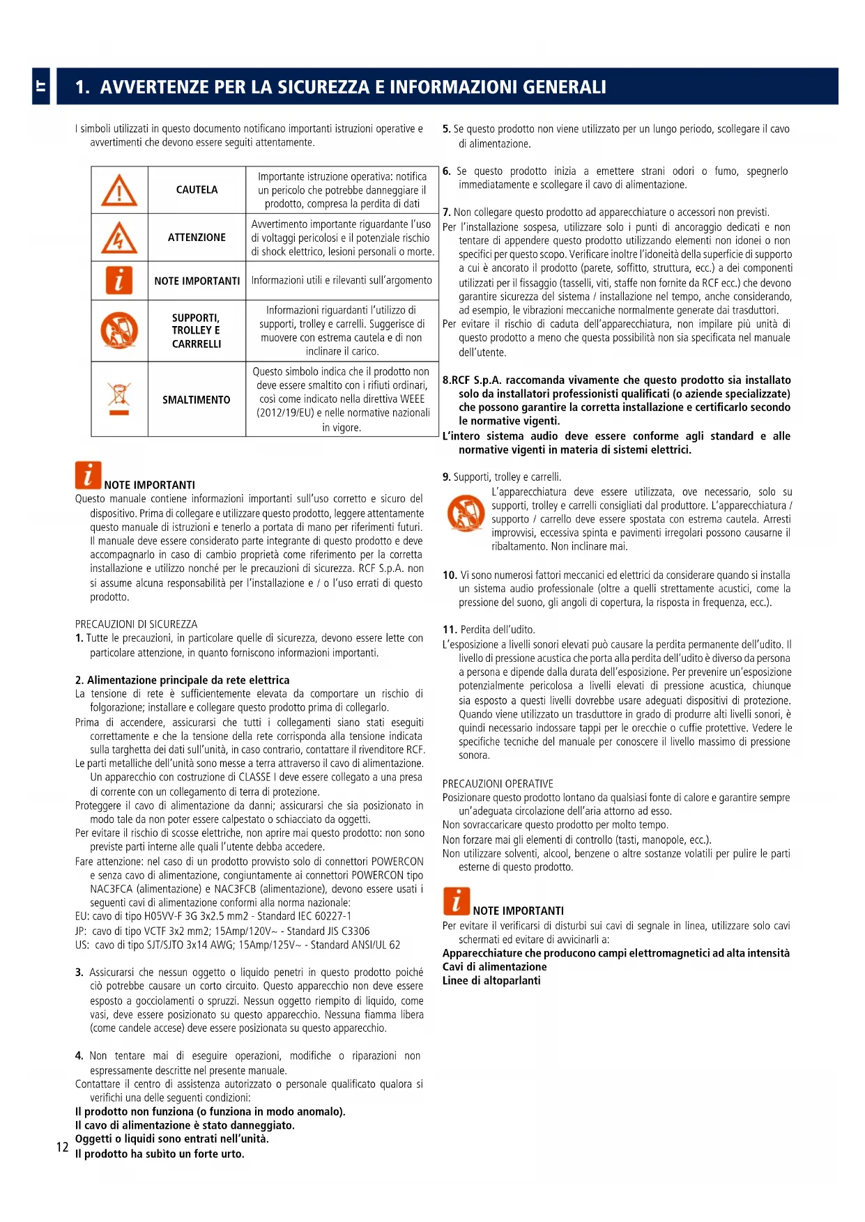 I simboli utilizzati in questo documento notificano importanti istruzioni operative e avvertimenti che devono essere seguiti attentamente. CAUTELA Importante istruzione operativa: notifica un pericolo che potrebbe danneggiare il prodotto, compresa la perdita di dati ATTENZIONE Avvertimento importante riguardante l’uso di voltaggi pericolosi e il potenziale rischio di shock elettrico, lesioni personali o morte. NOTE IMPORTANTI Informazioni utili e rilevanti sull’argomento SUPPORTI, TROLLEY E CARRRELLI Informazioni riguardanti l’utilizzo di supporti, trolley e carrelli. Suggerisce di muovere con estrema cautela e di non inclinare il carico. SMALTIMENTO Questo simbolo indica che il prodotto non deve essere smaltito con i rifiuti ordinari, così come indicato nella direttiva WEEE (2012/19/EU) e nelle normative nazionali in vigore. NOTE IMPORTANTI Questo manuale contiene informazioni importanti sull’uso corretto e sicuro del dispositivo. Prima di collegare e utilizzare questo prodotto, leggere attentamente questo manuale di istruzioni e tenerlo a portata di mano per riferimenti futuri. Il manuale deve essere considerato parte integrante di questo prodotto e deve accompagnarlo in caso di cambio proprietà come riferimento per la corretta installazione e utilizzo nonché per le precauzioni di sicurezza. RCF S.p.A. non si assume alcuna responsabilità per l’installazione e / o l’uso errati di questo prodotto.