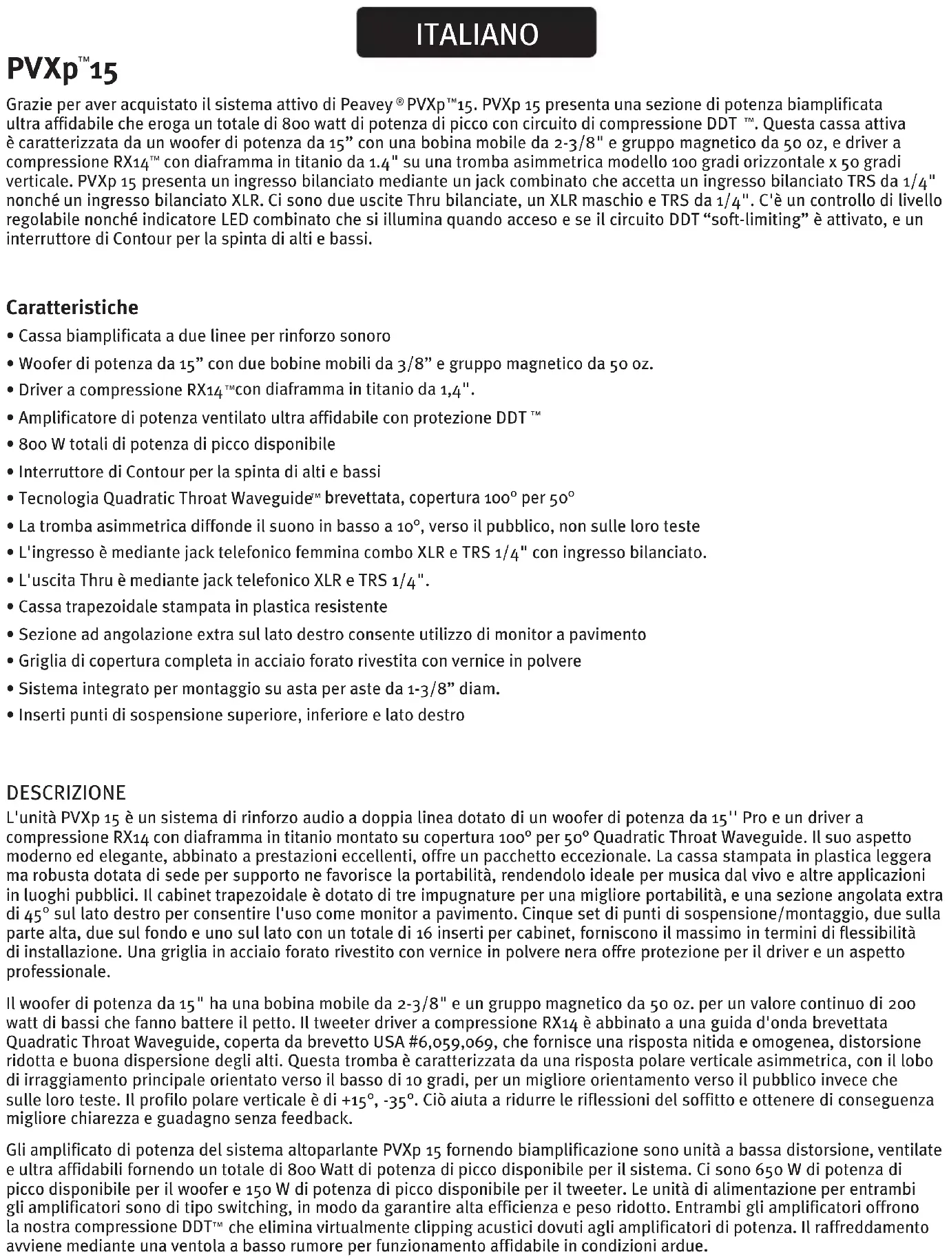 15 del mixer o qualsiasi dispositivo sorgente. Nel caso siano presente attenuatori per luci, potrebbe essere necessario impostare tali dispositivi su potenza massima o spegnerli per poter eliminare o ridurre il ronzio. Questo è un problema di interferenza tipico dei cablaggi in alternata e degli attenuatori per luci, e non un difetto di progettazione dell'unità PVXp 15. Il terzo cavo (connessione di terra) del connettore di alimentazione non deve MAI essere rimosso o spezzato, in quanto questo può comportare rischi di sicurezza. Suono distorto o confuso Assicurarsi innanzitutto che il mixer (la sorgente del segnale) non sia in clipping o sovraccarico. Assicurarsi che il controllo di livello (6) dell'unità PVXp 15 non sia impostato su un livello troppo basso. Verificare che i connettori di ingresso siano completamente inseriti nella presa di ingresso sul pannello posteriore dell'unità PVXp 15. Assicurarsi di non aver collegato l'uscita di un amplificatore al jack di ingresso dell'unità PVXp 15. Se si utilizza una prolunga per alimentare l'unità, assicurarsi che sia capace di condurre una corrente sufficiente e che non venga utilizzata per fornire corrente ad altri dispositivi. L'unità PVXp 15 è dotata di un equalizzatore Contour incorporato studiato per estendere e sfumare la naturale risposta degli altoparlanti del sistema. Quando il pulsante Contour è azionato, alcuni Bass Boost e equalizzazione degli alti danno al sistema una risposta nominalmente piatta, in modo da richiedere poco lavoro di equalizzazione, ove necessario. Nel caso in cui livelli di bass boost o di spinta degli alti siano applicati esternamente rispetto al PVXp 15, si potrebbe verificare sovraccarico prematuro del segnale ad alti livelli di pressione sonora. Ridurre i livelli di equalizzazione di dispositivi esterni (mixer, rack) e verificare se questo elimina la distorsione. Verificare per assicurasi che un segnale di livello di linea non entri attraverso il jack XLR, ciò ha 13 dB di guadagno in più rispetto al jack TRS da 1/4", e potrebbe essere sovraccaricato con elevati livelli di uscita del mixer. Infine occorre prendere atto che anche se l'unità PVXp 15 è un apparecchiatura ad alta potenza, possiede anch'essa dei limiti, e potrebbe necessitare di ulteriori unità attive (o di un subwoofer) per poter fornire potenza sonora o copertura sufficiente. In questo caso, provare ad abbassare leggermente i livelli del mixer e verificare se il problema viene risolto. Nel caso in cui i problemi persistano anche dopo aver seguito tutti gli accorgimenti elencati e aver eseguito altri rilevanti controlli, annotare attentamente tutte le condizioni osservate e rivolgersi al proprio rivenditore Peavey per ottenere una consulenza.