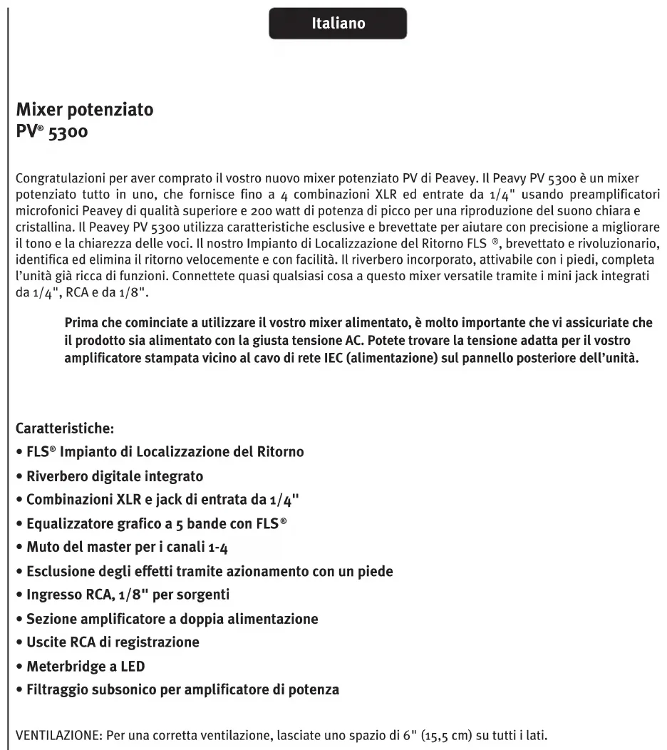 Congratulazioni per aver comprato il vostro nuovo mixer potenziato PV di Peavey. Il Peavy PV 5300 è un mixer potenziato tutto in uno, che fornisce fino a 4 combinazioni XLR ed entrata da 1/4 using preamplificatori microfonici Peavey di qualità superiore e 200 watt di potenza di picco per una riproduzione del suono chiara e cristallina. Il Peavey PV 5300 utilizza caratteristiche esclusive e brevettate per aiutare con precisiona a migliorare il tono e la chiarezza delle voci. Il nostro Impianto di Localizzazione del Ritorno FLS®, brevettato e rivoluzionario, identifica ed eliminà il ritorno velocimento e confacility. Il riverbero incorpore, attivabile con i piedi, completà l'unità più ricca di funzioni. Connette quasi qualsiasi casa a questo mixer versatile tramite i mini jack integrati da 1/4 , RCA e da 1/8 .