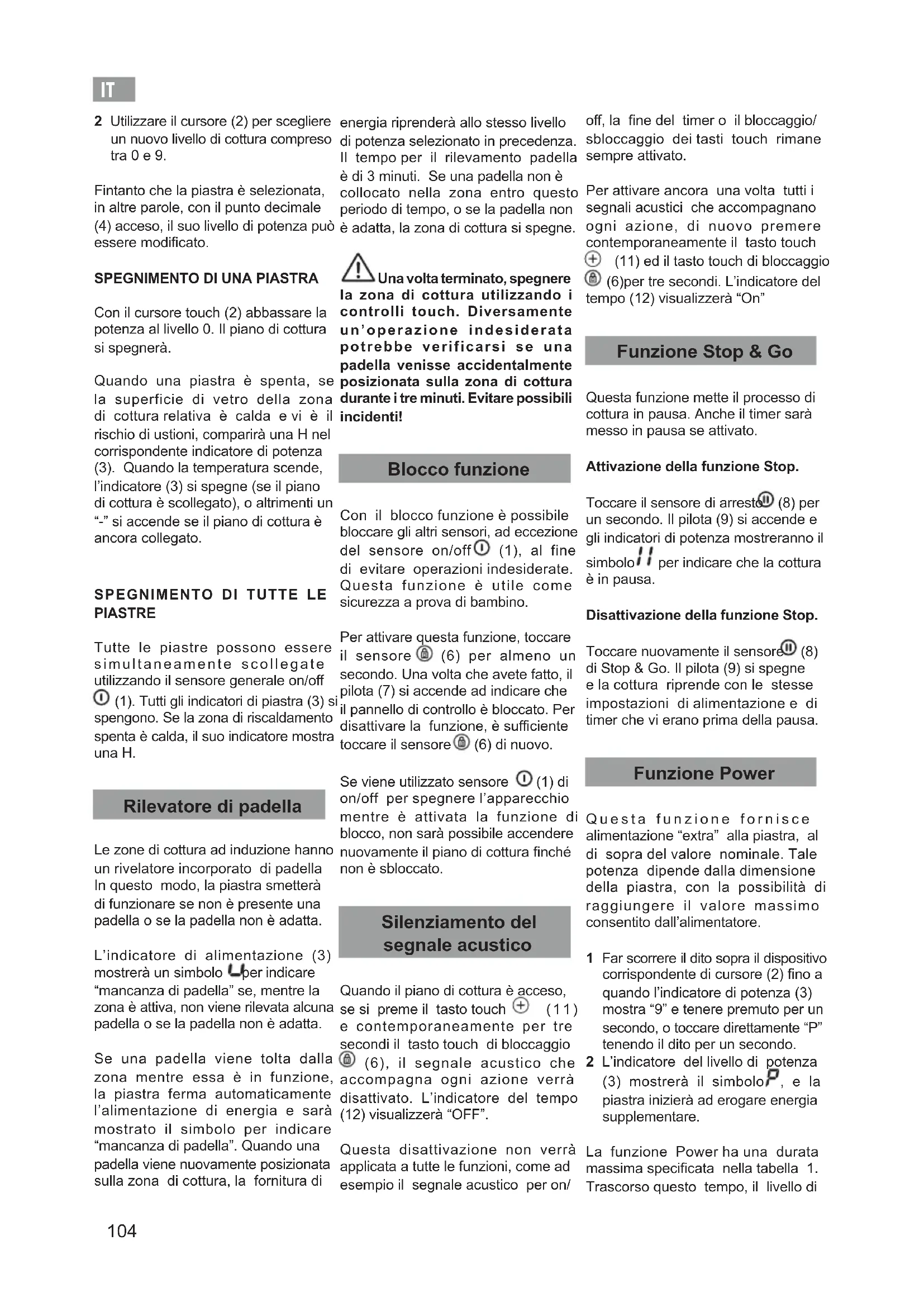 PIASTRE Tutte le piastre possono essere simultaneamente scollegate utilizzando il sensore generale on/o (1). Tutti gli indicatori di piastra (3) si spengono. Se la zona di riscaldamento spenta è calda, il suo indicatore mostra una H. Rilevatore di padella Le zone di cottura ad induzione hanno un rivelatore incorporato di padella In questo modo, la piastra smetterà di funzionare se non è presente una padella o se la padella non è adatta. L’indicatore di alimentazione (3) mostrerà un simbolo per indicare “mancanza di padella” se, mentre la zona è attiva, non viene rilevata alcuna padella o se la padella non è adatta. Se una padella viene tolta dalla zona mentre essa è in funzione, la piastra ferma automaticamente l’alimentazione di energia e sarà mostrato il simbolo per indicare “mancanza di padella”. Quando una padella viene nuovamente posizionata sulla zona di cottura, la fornitura di energia riprenderà allo stesso livello di potenza selezionato in precedenza. Il tempo per il rilevamento padella è di 3 minuti. Se una padella non è collocato nella zona entro questo periodo di tempo, o se la padella non è adatta, la zona di cottura si spegne. Una volta terminato, spegnere la zona di cottura utilizzando i controlli touch. Diversamente un’operazione indesiderata potrebbe verificarsi se una padella venisse accidentalmente posizionata sulla zona di cottura durante i tre minuti. Evitare possibili incidenti! Blocco funzione Con il blocco funzione è possibile bloccare gli altri sensori, ad eccezione del sensore on/off (1), al fine di evitare operazioni indesiderate. Questa funzione è utile come sicurezza a prova di bambino. Per attivare questa funzione, toccare il sensore (6) per almeno un secondo. Una volta che avete fatto, il pilota (7) si accende ad indicare che il pannello di controllo è bloccato. Per disattivare la funzione, è suciente toccare il sensore (6) di nuovo. Se viene utilizzato sensore (1) di on/off per spegnere l’apparecchio mentre è attivata la funzione di blocco, non sarà possibile accendere nuovamente il piano di cottura nché non è sbloccato. Silenziamento del segnale acustico Quando il piano di cottura è acceso, se si preme il tasto touch (11) e contemporaneamente per tre secondi il tasto touch di bloccaggio (6), il segnale acustico che accompagna ogni azione verrà disattivato. L’indicatore del tempo (12) visualizzerà “OFF”. Questa disattivazione non verrà applicata a tutte le funzioni, come ad esempio il segnale acustico per on/ o, la ne del timer o il bloccaggio/ sbloccaggio dei tasti touch rimane sempre attivato. Per attivare ancora una volta tutti i segnali acustici che accompagnano ogni azione, di nuovo premere contemporaneamente il tasto touch (11) ed il tasto touch di bloccaggio (6)per tre secondi. L’indicatore del tempo (12) visualizzerà “On” Funzione Stop & Go Questa funzione mette il processo di cottura in pausa. Anche il timer sarà messo in pausa se attivato. Attivazione della funzione Stop. Toccare il sensore di arresto (8) per un secondo. Il pilota (9) si accende e gli indicatori di potenza mostreranno il simbolo per indicare che la cottura è in pausa. Disattivazione della funzione Stop. Toccare nuovamente il sensore (8) di Stop & Go. Il pilota (9) si spegne e la cottura riprende con le stesse impostazioni di alimentazione e di timer che vi erano prima della pausa. Funzione Power Questa funzione fornisce alimentazione “extra” alla piastra, al di sopra del valore nominale. Tale potenza dipende dalla dimensione della piastra, con la possibilità di raggiungere il valore massimo consentito dall’alimentatore. 1 Far scorrere il dito sopra il dispositivo corrispondente di cursore (2) no a quando l’indicatore di potenza (3) mostra “9” e tenere premuto per un secondo, o toccare direttamente “P” tenendo il dito per un secondo. 2 L’indicatore del livello di potenza (3) mostrerà il simbolo , e la piastra inizierà ad erogare energia supplementare. La funzione Power ha una durata massima specicata nella tabella 1. Trascorso questo tempo, il livello diIT