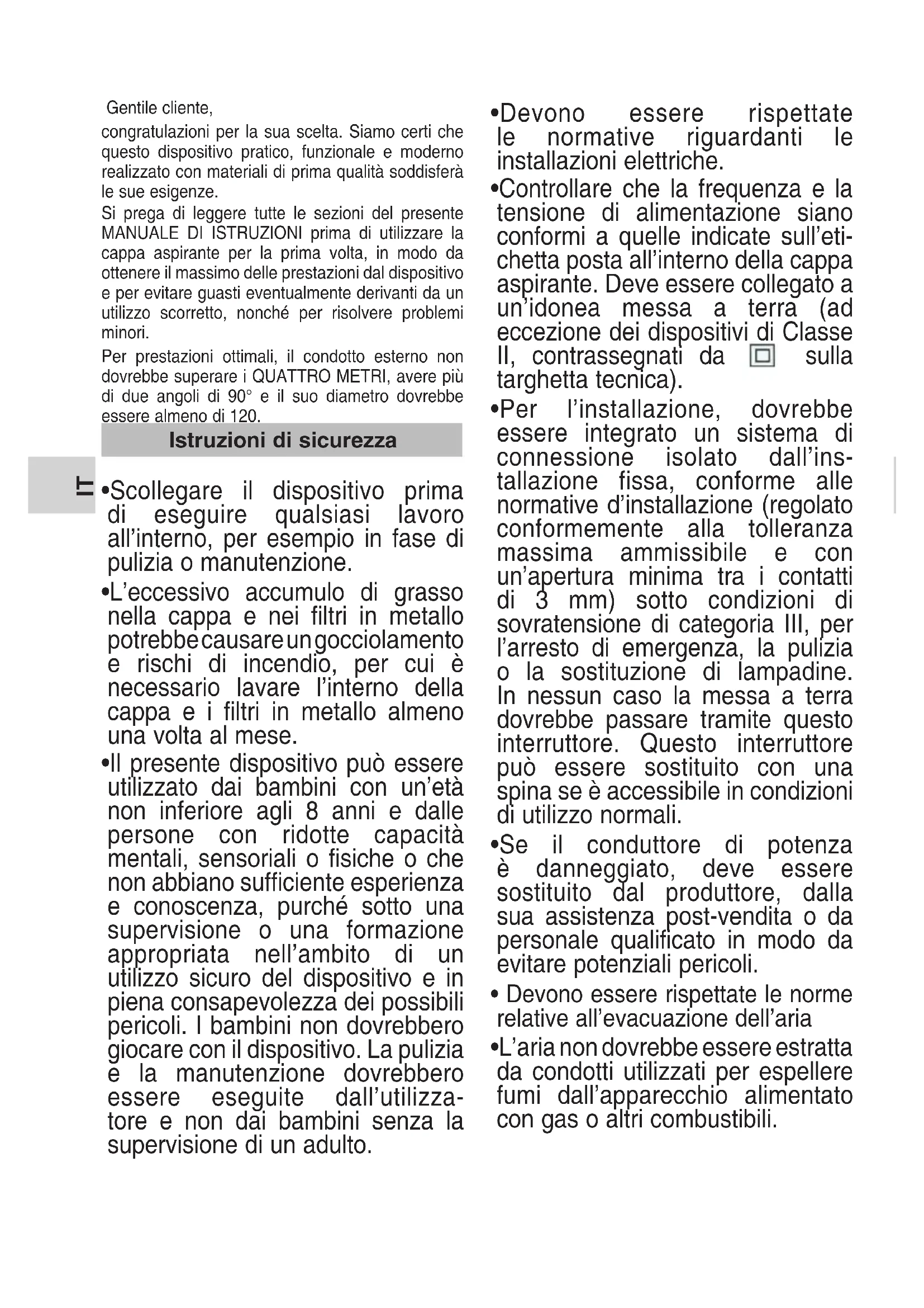 - Controllare che la frequenza e la tensione di alimentazione siano conformi a quelle indicate sull’eti- chetta posta all’interno della cappa aspirante. Deve essere collegato a un’idonea messa a terra (ad eccezione dei dispositivi di Classe II, contrassegnati da sulla targhetta tecnica).