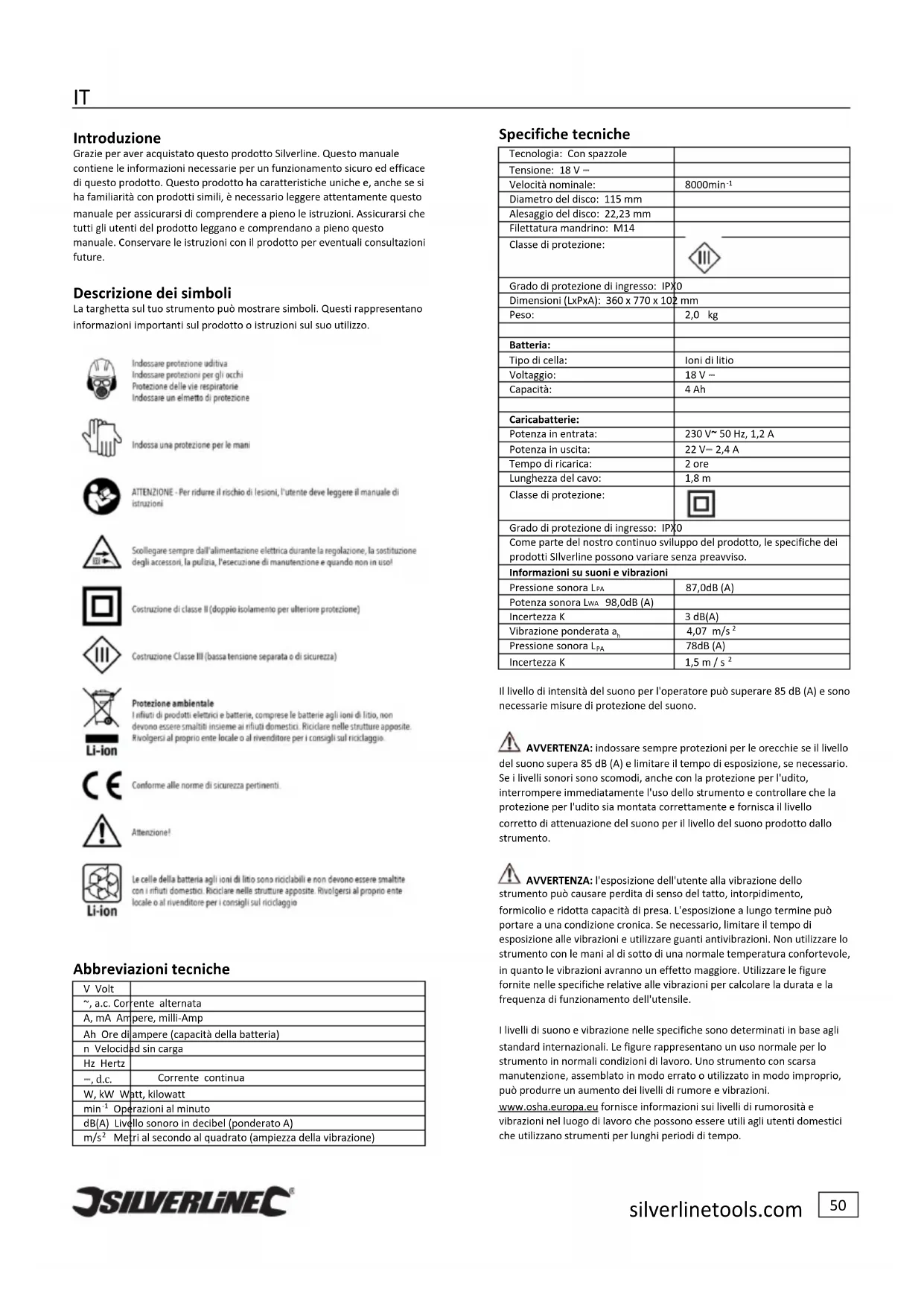 Introduzione Grazie per aver acquistato questo prodotto Silverline. Questo manuale contiene le informazioni necessarie per un funzionamento sicuro ed efficace di questo prodotto. Questo prodotto ha caratteristiche uniche e, anche se si ha familiarità con prodotti simili, è necessario leggere attentamente questo manuale per assicurarsi di comprendere a pieno le istruzioni. Assicurarsi che tutti gli utenti del prodotto leggano e comprendano a pieno questo manuale. Conservare le istruzioni con il prodotto per eventuali consultazioni future. Descrizione dei simboli La targhetta sul tuo strumento può mostrare simboli. Questi rappresentano informazioni importanti sul prodotto o istruzioni sul suo utilizzo. Abbreviazioni tecniche V Volt ~, a.c. Corrente alternata A, mA Ampere, milli-Amp Ah Ore di ampere (capacità della batteria) n Velocidad sin carga Hz Hertz ⎓, d.c. Corrente continua W, kW Watt, kilowatt min
