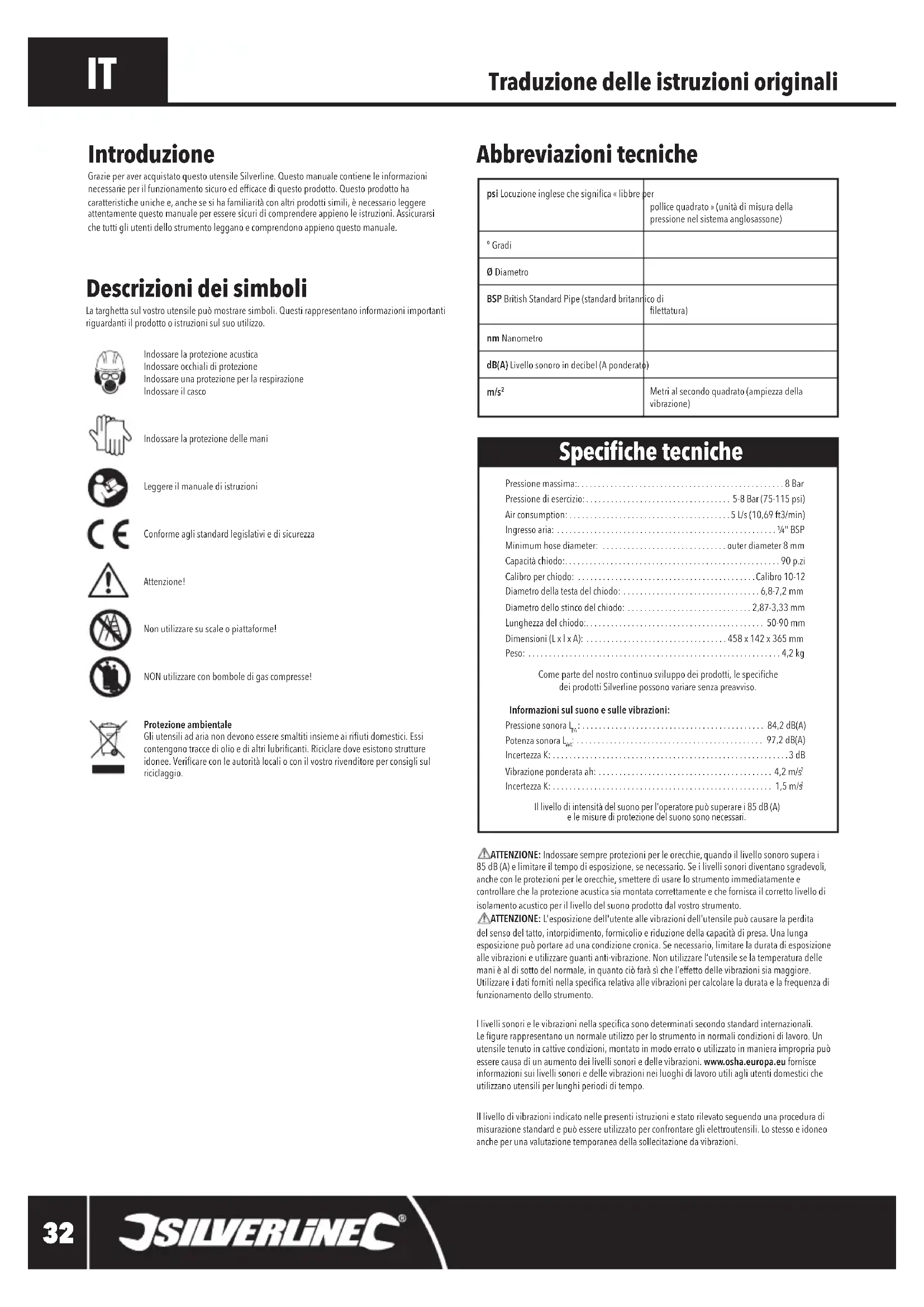 Illivellodiintensitàdelsuonoperl'operatorepuòsuperarei85dB(A) elemisurediprotezionedelsuonosononecessari. Introduzione GrazieperaveracquistatoquestoutensileSilverline.Questomanualecontieneleinformazioninecessarieperilfunzionamentosicuroedefcacediquestoprodotto.Questoprodottohacaratteristiche uniche e, anche se si ha familiarità con altri prodotti simili, è necessario leggere attentamentequestomanualeperesseresicuridicomprendereappienoleistruzioni.Assicurarsiche tutti gli utenti dello strumento leggano e comprendono appieno questo manuale. Speciche tecniche 282400_Manual.indd 32 30/08/2019 09:52Chiodatrice pneumatica 90 mm282400