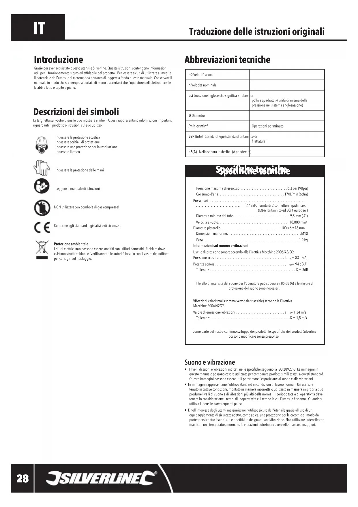 - IlivellidisuonievibrazioniindicatinellespecicheseguonolaISO28927-3.Leimmaginiin questo manuale possono essere utilizzate per comparare prodotti simili testati a questi standard. Queste immagini possono essere utili per stimare l’esposizione al suono e alle vibrazioni.• Le immagini rappresentano l’utilizzo standard in condizioni di lavoro normali. Un utensile tenuto in cattive condizioni, montato in maniera incorretta o utilizzato in maniera impropria può produrre livelli di suono e di vibrazioni più alti della norma. Il periodo totale di operatività deve tenere in considerazione i tempi di inoperatività e il tempo in cui l’utensile è spento. Quando si utilizza l’utensile fare frequenti pause.• È nell’interesse degli utenti massimizzare l’utilizzo sicuro dell’utensile grazie all’uso di un equipaggiamento di sicurezza adatto, come ad es. una protezione per le orecchie di modo da proteggersi contro i suoni alti e ripetitivi e dei guanti antivibrazione. Non utilizzare l’utensile con mani con una temperatura normale, le vibrazioni potrebbero avere effetti ancora maggiori. Traduzione delle istruzioni originali Abbreviazioni tecniche Descrizioni dei simboli La targhetta sul vostro utensile può mostrare simboli. Questi rappresentano informazioni importanti riguardanti il prodotto o istruzioni sul suo utilizzo.Indossare la protezione acusticaIndossare occhiali di protezioneIndossare una protezione per la respirazioneIndossare il cascoIndossare la protezione delle maniLeggere il manuale di istruzioniNONutilizzareconbomboledigascompresse!Conforme agli standard legislativi e di sicurezza.Protezione ambientale Iriutielettricinonpossonoesseresmaltiticoniriutidomestici.Riciclaredoveesistonostruttureidonee.Vericareconleautoritàlocalioconilvostrorivenditoreper consigli sul riciclaggio.n0 Velocità a vuoton Velocità nominalepsi Locuzioneinglesechesignica«libbreperpollice quadrato » (unità di misura della pressione nel sistema anglosassone)Ø Diametro/min or min Operazioni per minutoBSP British Standard Pipe (standard britannico di lettatura)dB(A) Livello sonoro in decibel (A ponderato) Introduzione Grazie per aver acquistato questo utensile Silverline. Queste istruzioni contengono informazioni utiliperilfunzionamentosicuroedafdabiledelprodotto.Peresseresicuridiutilizzarealmeglioil potenziale dell’utensile si raccomanda pertanto di leggere a fondo questo manuale. Conservare il manuale in modo che sia sempre a portata di mano e accertarsi che l’operatore dell’elettroutensile lo abbia letto e capito a pieno. Speciche tecniche Speciche tecniche Pressione massima di esercizio:.............................6,3 bar (90psi) Consumo d'aria: ........................................170L/min (6cfm) Presa d’aria:........................................................... . . . . . . . . . . . . . . . . . . . . . . . . . . . . . . . ⁄4" BSP, fornita di 2 connettori rapidi maschi (EN-6 britannico ed EQ-4 europeo ) Diametro minimo del tubo: ..................................9,5 mm (