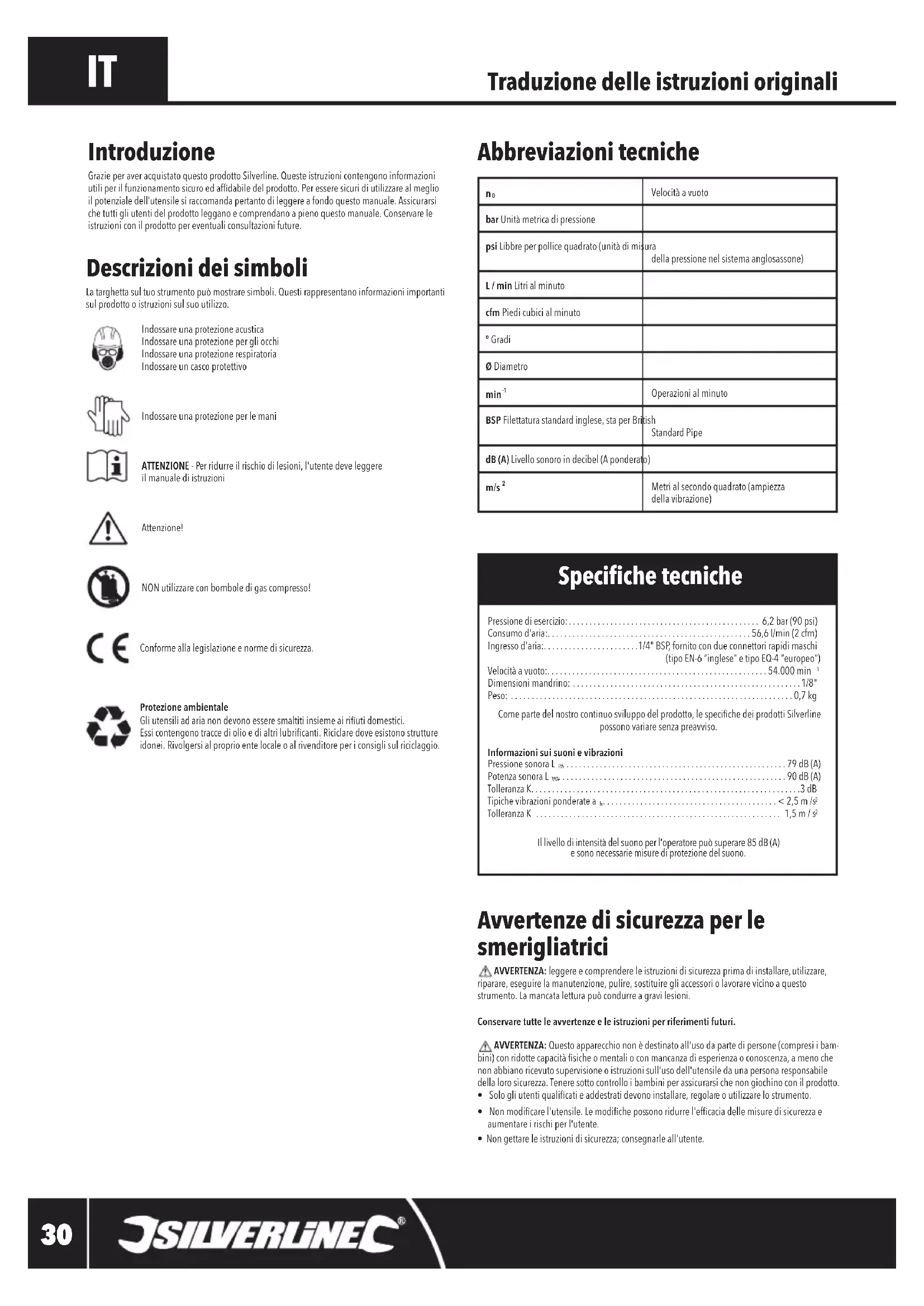 Metri al secondo quadrato (ampiezza della vibrazione) Introduzione Grazie per aver acquistato questo prodotto Silverline. Queste istruzioni contengono informazioni utiliperilfunzionamentosicuroedafdabiledelprodotto.Peresseresicuridiutilizzarealmeglioil potenziale dell’utensile si raccomanda pertanto di leggere a fondo questo manuale. Assicurarsi che tutti gli utenti del prodotto leggano e comprendano a pieno questo manuale. Conservare le istruzioni con il prodotto per eventuali consultazioni future.