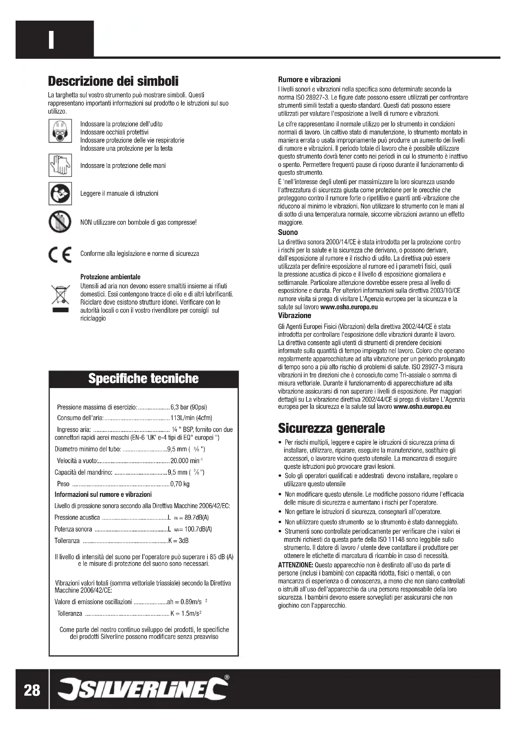 - Strumenti sono controllate periodicamente per verificare che i valori ei marchi richiesti da questa parte della ISO 11148 sono leggibile sullo strumento. Il datore di lavoro / utente deve contattare il produttore per ottenere le etichette di marcatura di ricambio in caso di necessità. ATTENZIONE: Questo apparecchio non è destinato all'uso da parte di persone (inclusi i bambini) con capacità ridotta, fisici o mentali, o con mancanza di esperienza o di conoscenza, a meno che non siano controllati o istruiti all'uso dell'apparecchio da una persona responsabile della loro sicurezza. I bambini devono essere sorvegliati per assicurarsi che non giochino con l'apparecchio. Descrizione dei simboli La targhetta sul vostro strumento può mostrare simboli. Questi rappresentano importanti informazioni sul prodotto o le istruzioni sul suo utilizzo. Indossare la protezione dell'udito Indossare occhiali protettivi Indossare protezione delle vie respiratorie Indossare una protezione per la testa Indossare la protezione delle mani Leggere il manuale di istruzioni NON utilizzare con bombole di gas compresse! Conforme alla legislazione e norme di sicurezza Protezione ambientale Utensili ad aria non devono essere smaltiti insieme ai rifiuti domestici. Essi contengono tracce di olio e di altri lubrificanti. Riciclare dove esistono strutture idonei. Verificare con le autorità locali o con il vostro rivenditore per consigli sul riciclaggio Specifiche tecniche Pressione massima di esercizio: .................... 6,3 bar (90psi) Consumo dell'aria: ......................................... 113L/min (4cfm) Ingresso aria: ................................................ ¼ " BSP, fornito con due connettori rapidi aerei maschi (EN-6 'UK' e-4 tipi di EQ" europei ") Diametro minimo del tubo: ............................9,5 mm (